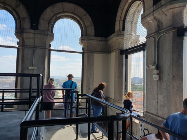 Das alte Post-Office-Building war zwischendurch Trump-Hotel und ist nun das Waldorf-Astoria. Ein – ganz kleiner – Teil ist Museum zum Post-Building und Zugang zum Turm. Das muss man wissen und finden! Doreen hat so was natürlich auf der Pfanne. Und führt uns zielsicher zu der Tür. Auf die Idee wäre ich allein nie gekommen und wenn, dann hätte ich es kaum gefunden. Auch hier: Taschenkontrolle, aber manuell! Und dann ein langer Gang an einer Menge beschrifteter Fotos vorbei. Hier wird die Geschichte des Gebäudes widergegeben. Im Fahrstuhl dann hoch.
