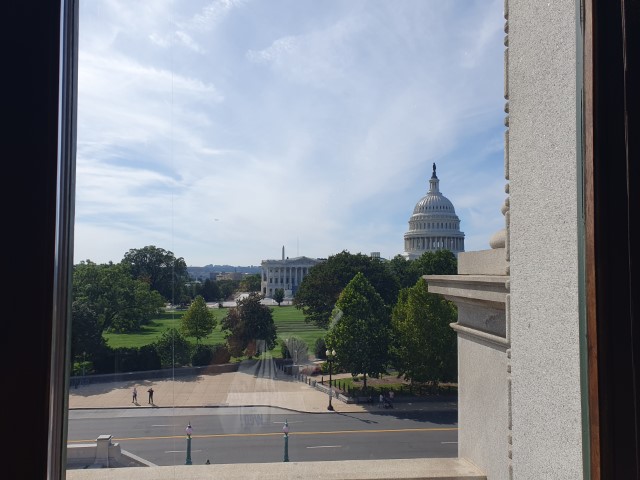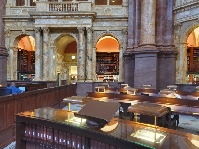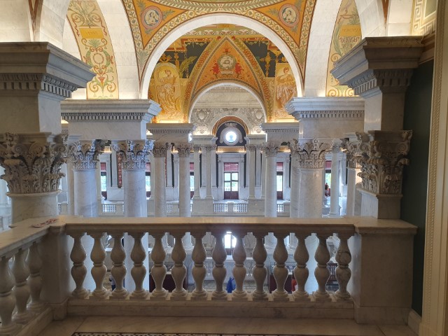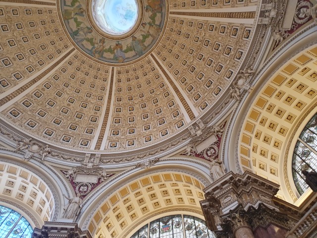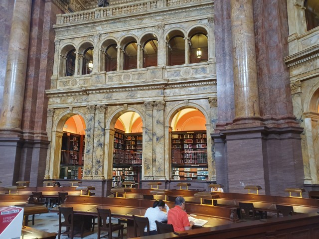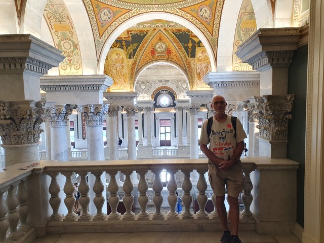 Die Library of Congress ist ein Muss bei der Washington-Besichtigung. Die sind nicht ganz so streng bei der Eingangskontrolle wie im Capitol. Also nehme ich den Rucksack mit. Dann kann ich hinterher einkaufen, während Michèle zurück wandert. Wir sind ne halbe Stunde zu früh da, denn für den Eintritt braucht man ein Time-Ticket. Doch es ist so wenig los, dass die nicht auf die Uhrzeit schauen – und zack sind wir drinnen. Bekommen einen deutschen Plan und den Hinweis, dass in 3 Minuten eine Besuchergruppe den Haupt-Lesesaal betreten darf. Das wollte ich Michèle ersparen, haben wir beim letzten Mal doch bald ne Stunde angestanden. Doch nun laufen wir hin, bekommen einen roten Aufkleber und sind schon im Lesesaal. Gut – so kann man das auch machen.