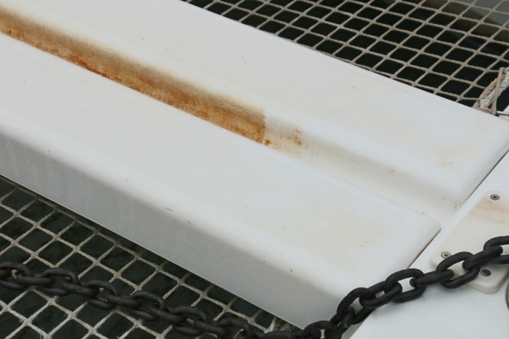 Die Bilder zeigen den Erfolg der Putzaktion: Ganz schlimm natürlich die Rinne der Ankerkette. Im ersten Bild schon mal angefangen, im zweiten dann im Endstadium. 100% versuchen wir hier nicht zu erreichen, denn die Kette wird es ja wieder ordentlich einrosten….