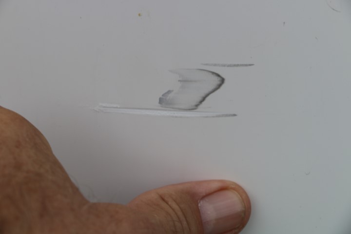 Ich sitze auf der Toilette, als ein Schlag gegen RE mich – nun nicht ganz – aber doch ein wenig vom Thron wirft. Raus: Ein nicht sehr großes Motorboot stieß nach dem Tanken bei uns gegen den Bug. Der Motorbootfahrer verkündet: „Nichts passiert“ und macht sich davon, bevor ich auch nur das Dinghy im Wasser habe. Michèle macht ein paar Fotos von ihm und seinem Boot, ich komme endlich an den Bug. Nun: Eine deutlich sichtbare Schramme. Es hat ja auch ganz schön gerumst.