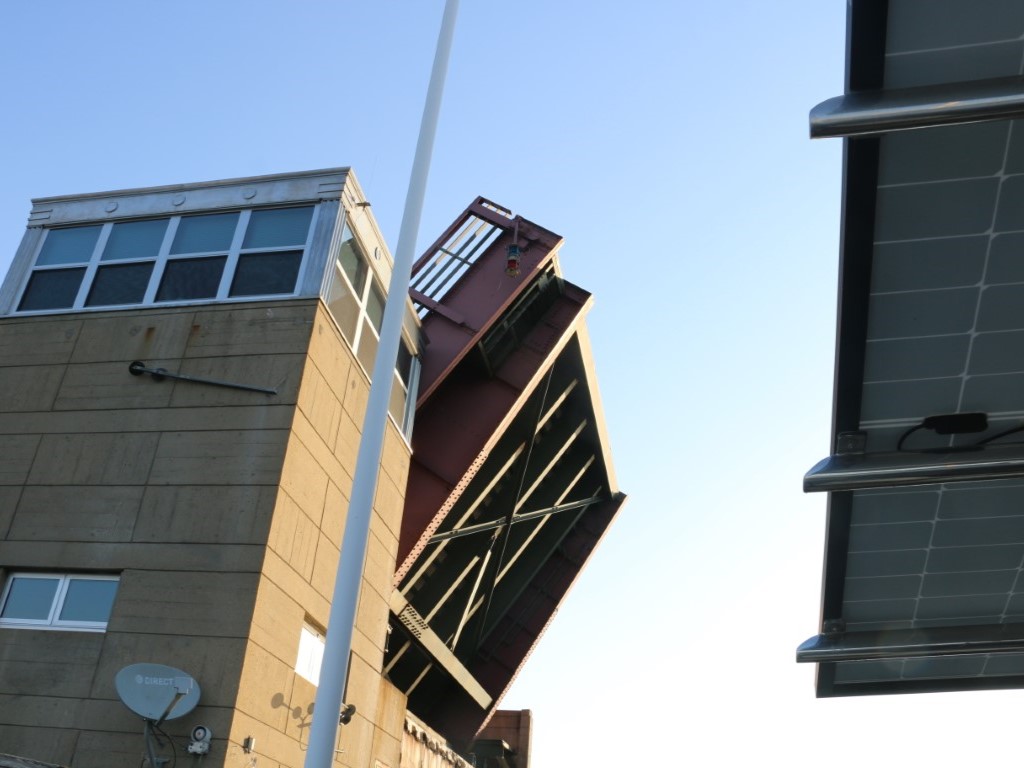 Gleich darauf versperrt eine Brücke unseren Weg. Kanal 13 – Anruf und schon bekommen wir die Meldung: Noch 7 Minuten. Dann geht es weiter landeinwärts. Doreen hatte uns gestern Abend schon einen „PIN“ geschickt: Eine Markierung in Google Maps, wo Broom gelegen hat. Ja – da ist ausreichend Platz. So ankern wir in Steinwurfnähe zu VITAMIN SEA. Fein!