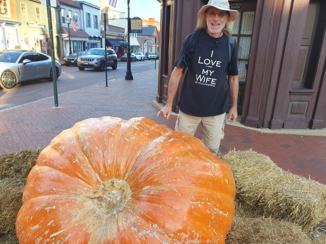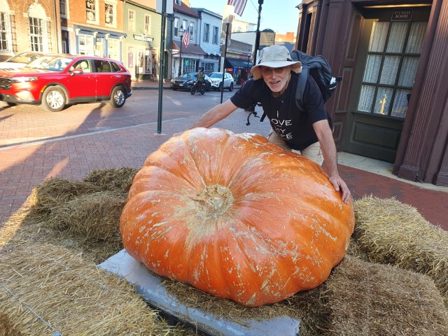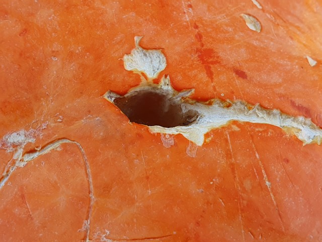 An einem dicken Kürbis sind wir schon mehrfach vorbei gegangen. Heute entdecken wir, dass der echt ist – kein Plastik! Ok – dann müssen noch Fotos gemacht werden! Mit dem kleinen Finger entnehme ich eine „Probe“. Ja – echter Kürbis!