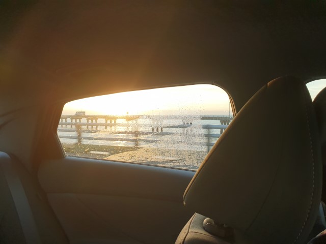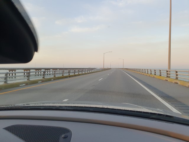 Über der (ewig) langen Brücke über die Einfahrt in die Chesapeake Bay geht die Sonne auf. Ich zeige Michèle, wo ich lang gesegelt bin. Und zweimal geht es dann „unter Deck“ – in die Tunnel, die der Schifffahrt freie Fahrt geben.