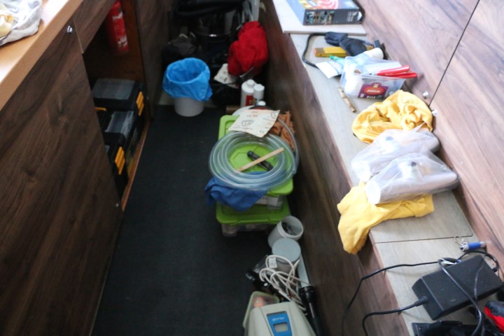 Zu guter Letzt gehe ich noch die Werkstatt kontrollieren! Oh weh! Chaos. Das Schadensbild erklärt mir, was passiert ist: RE wurde durch ein entsprechende Welle kräftig zur Seite geworfen und dann ganz abrupt in der Seitwärtsbewegung gestoppt. Nur die Einzelteile bewegten sich noch weiter. Und so liegen alle Sachen – und da ist schweres Material dabei (!) – auf der Bank an Steuerbord. Nur was da nicht mehr rauf passte, das liegt nun auf dem Boden. Ein Viertelstündchen Aufräumarbeit später ist alles seefest und gut für die nächsten Tage gestaut und gesichert.