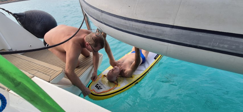 Das Ganze heute sehr komfortabel! Denn Peter hat morgens das SUP (Stand Up Paddleboard) repariert, das ich in Cape Charles mit defektem Ventil geschenkt bekam. Er hat einfach das Ventil aus der Stellung: „Entleeren“ in die Stellung „Befüllen“ gestellt! Und dann aufgepumpt. So kann ich mich auf dem Rücken auf das SUP legen und die Vorarbeiten in wenigen Sekunden erledigen. Zumal Peter an einem langen Tau das SUP auf Position hält!