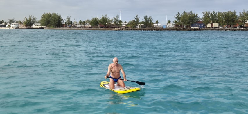Ok – dann muss ich einmal probieren, mit dem SUP ein Runde zu drehen. Seeeeehr wackelig! Siehe erster Film! Für die lästernden Experten: Das Ding ist ein 8 Fuß SUP – 140 Liter. Richtig für meine Größe und Gewicht: 320 Liter! Also mehr als doppelt so groß!