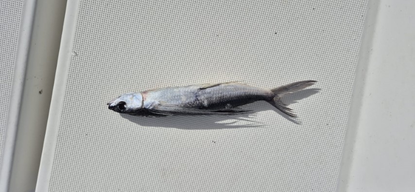 Auf dem Vordeck entdecke ich eine Leiche! Die Crew wird zusammen gerufen, um ein anständiges Seebegräbnis zu zelebrieren. Melanie macht einige Fotos. Und ganz pietätslos muss ich dann noch die Flügel ausbreiten. Tschüß, fliegender Fisch!