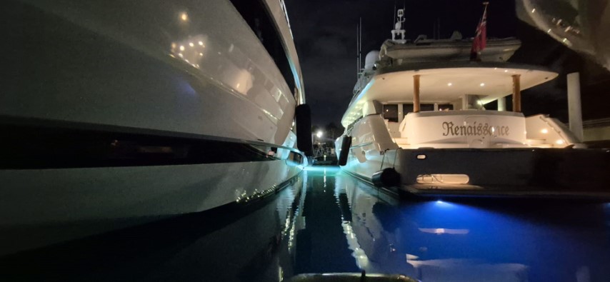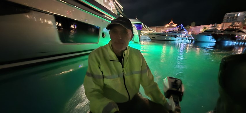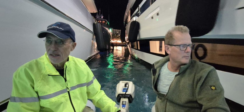 Den ersten Tagesordnungspunkt erledigt Peter mit einem Satz. Ob er die Löcher im Rumpf mit einem Tape innen dicht setzen soll. Nun – die sind von meiner Notabdichtung noch dicht. Und außen hatte ich gestern ja nach dem Spülen Tape drüber geklebt. Wie sollen die dann trocknen? Also Notabdichtung weg, Tape ab, noch mal spülen, noch mal Tape außen drauf.