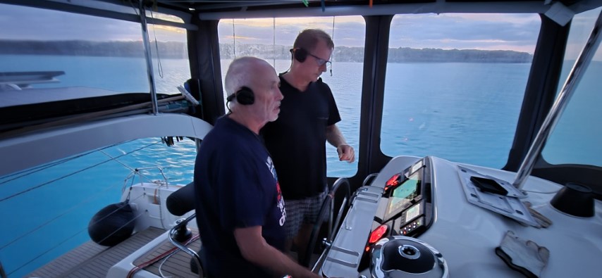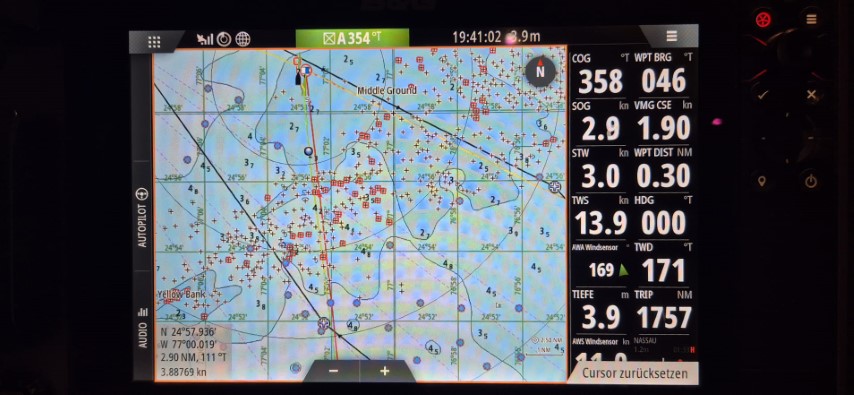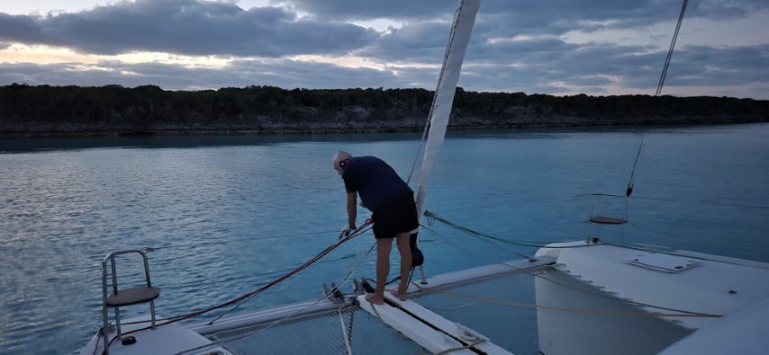Gegen 6 Uhr kruschelte Chrischan an Bord schon rum, um Vorbereitungen für das Ankerauf zu treffen. Peter unterstützte ihn und so ging es um 6:25 h unter Motor aus der Bucht und ab 7 Uhr mit dem Parasailor ganz gemach mit 5 Knoten Richtung Nassau.