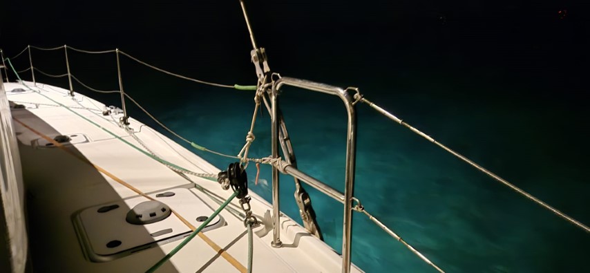 Im Laufe des Tages nahm der Wind etwas ab, so dass wir mehr oder weniger dahin dümpelten, aber jede Meile zählt, die wir nicht motoren müssen. Gegen Abend bekamen wir dann wieder etwas mehr Fahrt, so dass wir unser Tagesziel „Blue Hole“ doch noch gegen 20 Uhr erreichen. Die Segel wurden unter Deckbeleuchtung geborgen und wir ankerten auf dem offenen Meer bei einer Wassertiefe von 4 m. Jedoch ist eine schauklige Nacht vorprogrammiert.