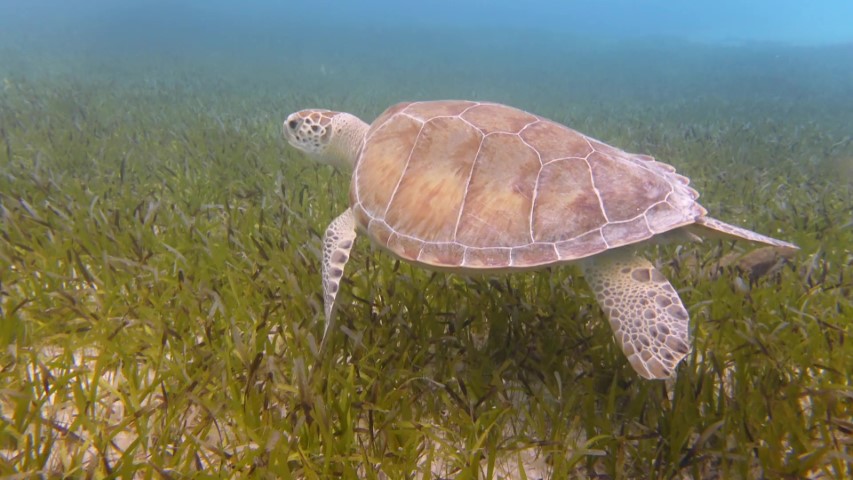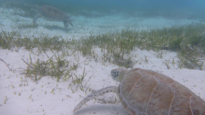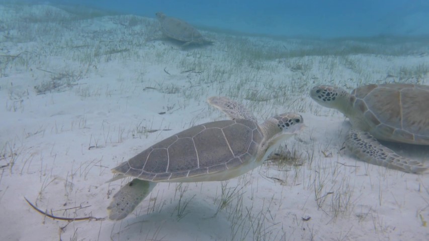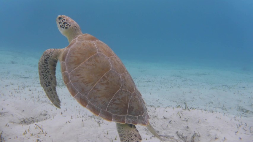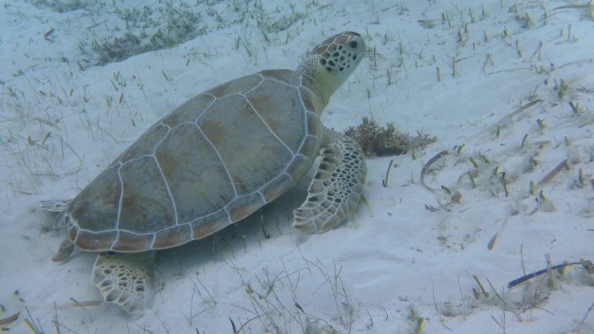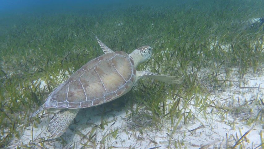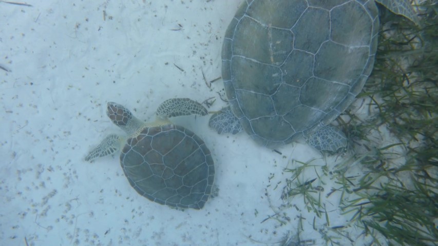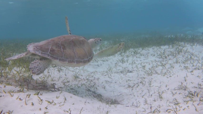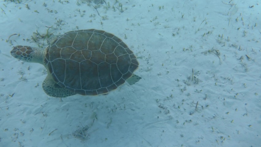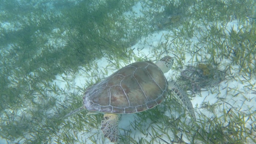 Es sind gefühlt hunderte. Auf Schritt und Tritt, oder besser, auf Flossenschlag und Flossenstoß , entdecke ich weitere Schildkröten. Gut, hundert sind es nicht, aber 10 mindestens! Das macht wirklich so einen Spaß, super mega geil!!!! Ich tauche neben sie, lege mich auf den Boden und beobachte sie beim Fressen - Seegras ist sehr beliebt und wird abgegnabbelt resp. rausgerupft -, filme sie von oben, von unten, wenn sie auftauchen, von der Seite. So herrliche Tiere! Große und kleine.