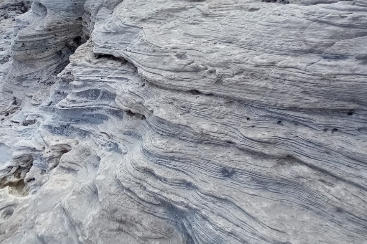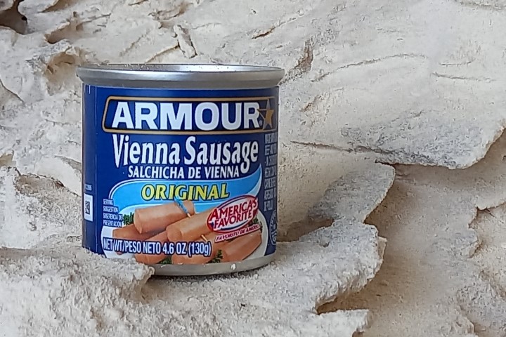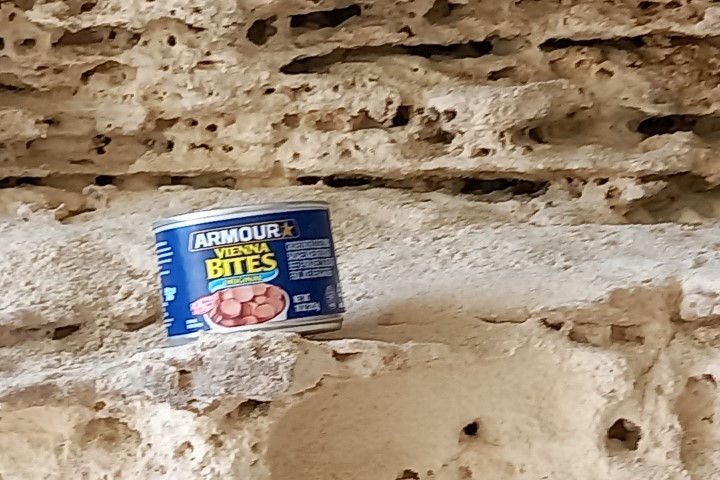 Also machen wir uns auf den Rückweg. Und da stolpern wir über einen Pfeil. Aus Steinen gelegt haben wir den auf dem Hinweg übersehen. Nun – dann gehen wir hier mal wieder Richtung Wasser. Es kostet zwar einige Kletterei, aber dann sind wir in der „Cave“. Beeindruckend ist anders. Mit gutem Willen kann man sie mit 5 Meter Einbuchtung angeben. Ein Felsbrocken in der Mitte kann als Tisch interpretiert werden. Und so machen wir Rast. Ooops – da ist auch hier Zivilisations-Dreck!? Ich entdecke eine Dose. Nochmal ooops – die ist ungeöffnet. Und da fällt mir ein und auf: Ja – es ist eine Tradition, hier Wiener Würstchen zu hinterlassen! Und es ist eine Dose Vienna Sausages! Dann entdecke ich auch noch eine zweite! Und: Beide sind noch lange nicht abgelaufen. Gut – wenn das die Verrücktheit dieses Ortes ist, dann lass ich die Dosen hier. Wir selbst haben keine mit. Und es würde mir auch sehr widerstreben, aus Dafke hier Lebensmittel hin zu stellen. Aber wir wollen die Tradition respektieren und lassen so die beiden Dosen stehen!