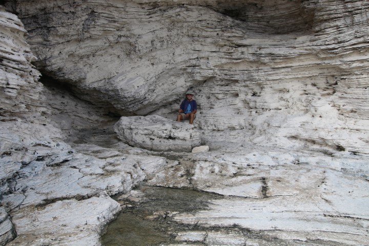Am Ende kommen wir auf der höchsten Spitze im Norden an. 146 Höhenmeter haben wir gemacht! Whow! Und sind mindestens 25 Meter über der Wasseroberfläche! Nur: Eine „Cave“ haben wir nicht gesehen. Ich bin immer wieder so weit raus geklettert, wie möglich. Und habe sie gesucht. Kann nur sagen: Die letzten 3 Einschnitte sicher nicht!