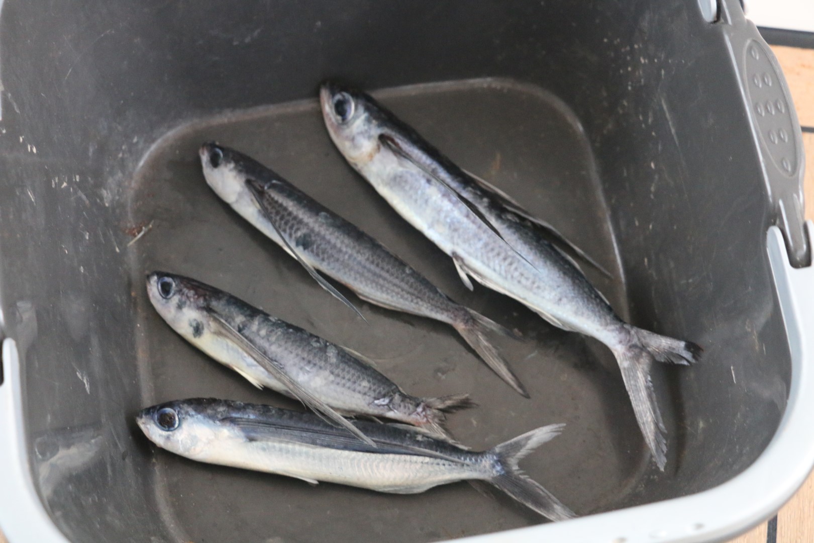 [Bild 1: Fliegende Fische im Eimer] Bei näherer Betrachtung entscheide ich: Einer ist heringsgroß, der wird genommen, die anderen sind kleiner. Mit Hunger sicher interessant, aber...