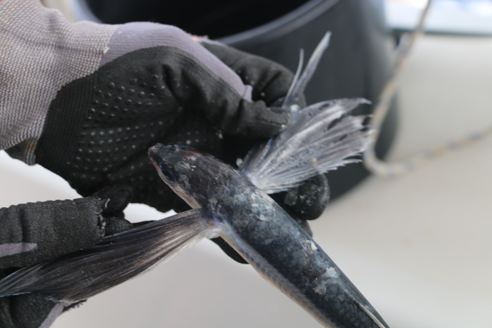 Aber heute bei der ersten Dämmerung "mache" ich meine ersten vier Fische. Gut - die Angel habe ich noch gar nicht ausgebracht. Da liegt es also nicht dran. Nein - es liegt auf dem Oberdeck und im Trampolin. Vier fliegende Fische. Das Gute: Alle schon tot. Brauche ich nur noch einzusammeln. Ein kleines Geschenk von Neptun. Dem haben wir zu Beginn der Fahrt ordnungsgemäß geopfert. Nun gibt er zurück.