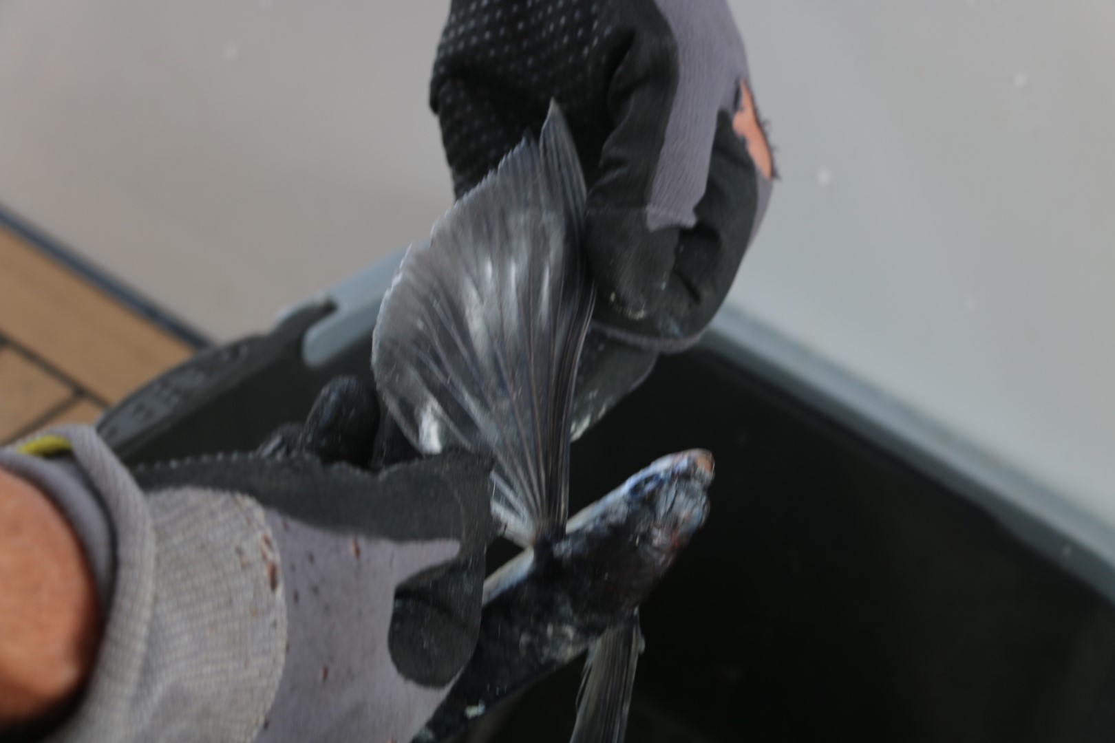 Kopf, Schwanz und Flügel ab. Ausgenommen und in Butter kurz angebraten. So gibt es heute halt Fisch zum Frühstück. Fliegenden Fisch hatte ich vor über 40 Jahren das letzte Mal in Trinidad gegessen. Und die Erinnerung trügt nicht: Der schmeckt ein wenig nach Hühnchen. Nicht, dass Huhn einen starken Eigengeschmack hätte, aber fischig ist es eben nicht!