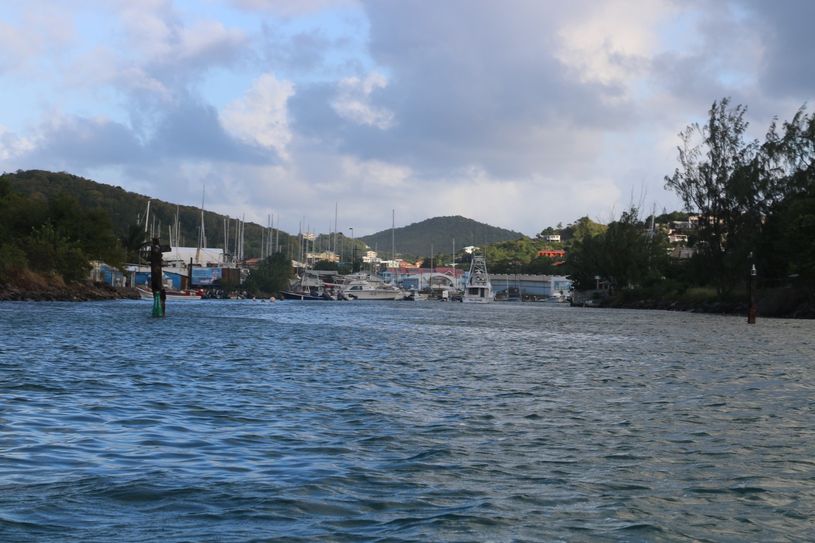 Im Hafen nutzt Michèle dann unser Horn, um lautstark auf die Ankunft aufmerksam zu machen. Was ich mir vorher so nicht vorstellen konnte: Sie hat einen Mordsspaß daran. Brav fallen die anderen Schiffe im Hafen ein, die Crews kommen an Deck und applaudieren. Ein schöner Empfang. Wir müssen fast um alles rum, da ihr Liegeplatz von hinten zu erreichen ist. Und dann am Platz: Eine richtig kleine Menschenmenge nimmt die Cloud Jumper in Empfang. Das letzte Schiff, das noch richtig begrüßt wird. Ganz hinten trottet noch die Olimir, die aber mit Maschinenproblemen inzwischen in Kapverden eine weitere Zwischenstation macht. Also – irgendwie kann man die nicht mehr mitzählen, denn es ist ungewiss, wann die sich auf den langen Weg macht und ob sie dann noch nach St. Lucia läuft.