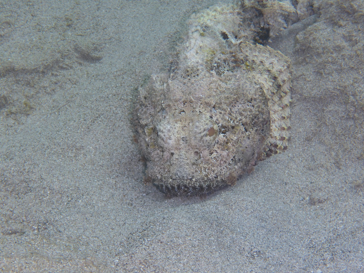Während ich da hinfahre, möchte Michèle lieber die Bucht abschnorcheln. Für mich sind es nur wenige 100 Meter mit dem Schlauchboot. Direkt westlich werfe ich in alter Minentaucher-Manier einen Sinker als Anker für das Schlauchboot und schnorchle einmal um das Inselchen. Highlights: Als ich im Norden auftauche liegt da ein anderes Schlauchboot mit 2 Anglern. Und im Süden der Insel sind ein paar Fische, sage ich den beiden aber nicht…