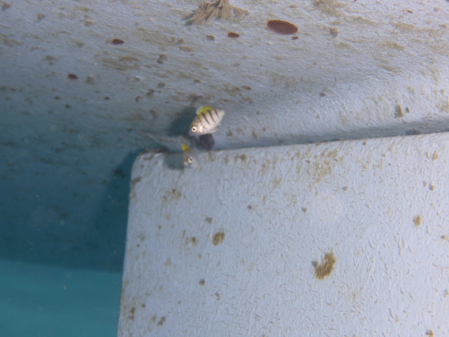Zwei Tage später hat sich auch ein kleines Zebra-Fischchen dazu gesellt. Und tags drauf 2 weitere. Die Zebrafische sind nicht ganz so ängstlich, aber gehen schon in Richtung der Öffnung, wenn man näher kommt.