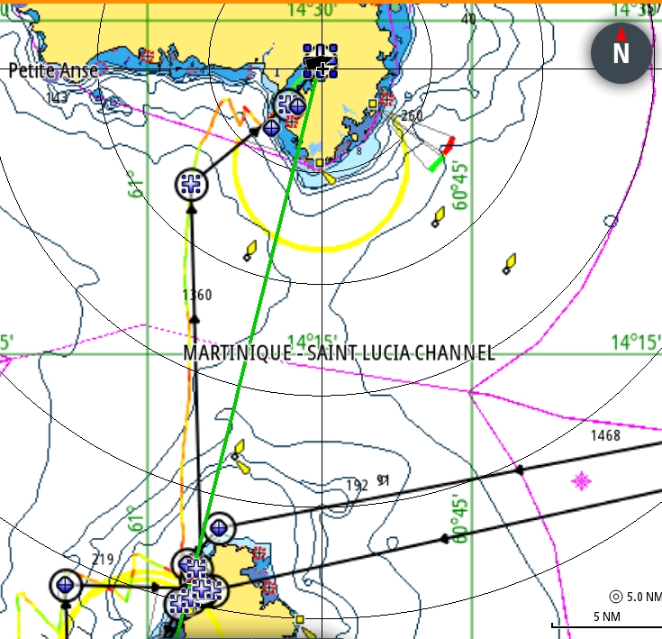 Wie geplant stehe ich um 06.00 Uhr auf und mache das Schiffchen seeklar. Um 06.40 nimmt Michèle den Anker auf und ich setzte noch im Drehen die Segel. Schon gehen die Motoren aus und langsam schieben wir uns aus unserer Saint Lucia Heimat, der Rodney Bay. Vorbei am Pigeon Island – da oben waren wir auch! Hier, wo wir jetzt stehen, war auch ein Katamaran, als wir von oben runter schauten. Langsam nimmt der Wind zu und die Fahrt wird schneller.