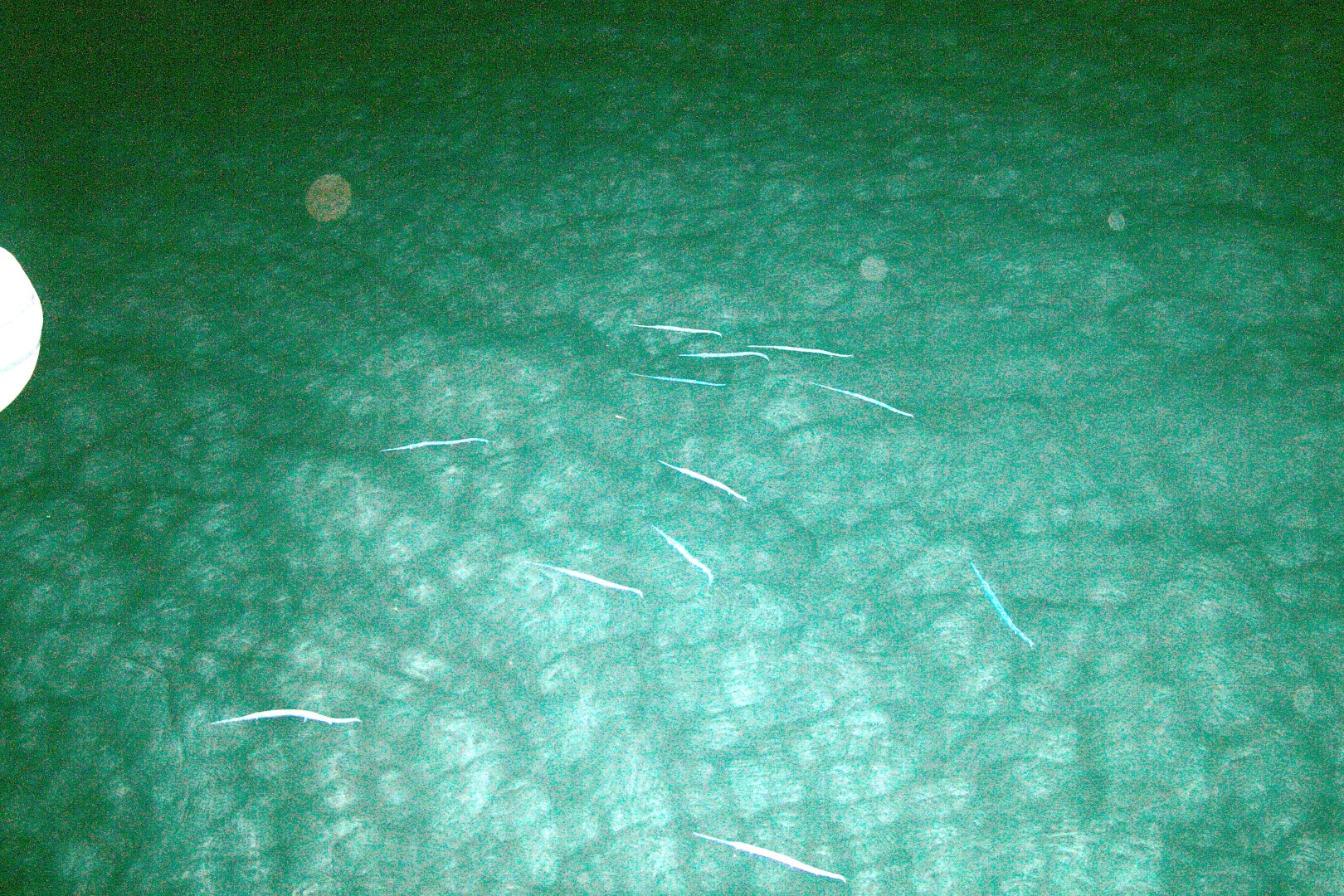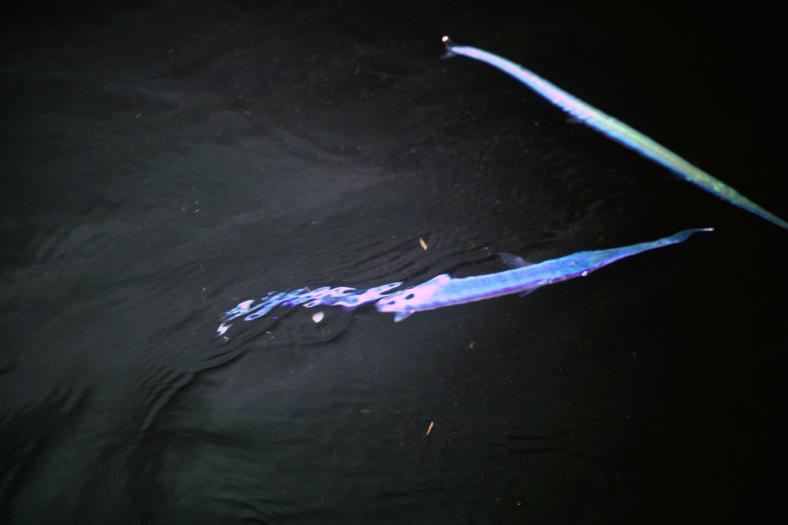 Es plätschert nach Dunkelwerden um unser Schiffchen. Da ist ne Menge Meeresgetier, das nun aktiv wird. Oder die nun an die Oberfläche kommen. Manche Abende können wir wahre Schwärme an Fliegenden Fischchen sehen. Und heute leuchtete Michèle mit unserer Superlampe ins Wasser. Nadelfische zeigten sich. Erst einer, dann – vielleicht durch das Licht? – wurden es nett viele. Leider sind die Aufnahmen in der Farbe des Wassers etwas extrem. Aber die Nadeln sieht man ja ganz gut….