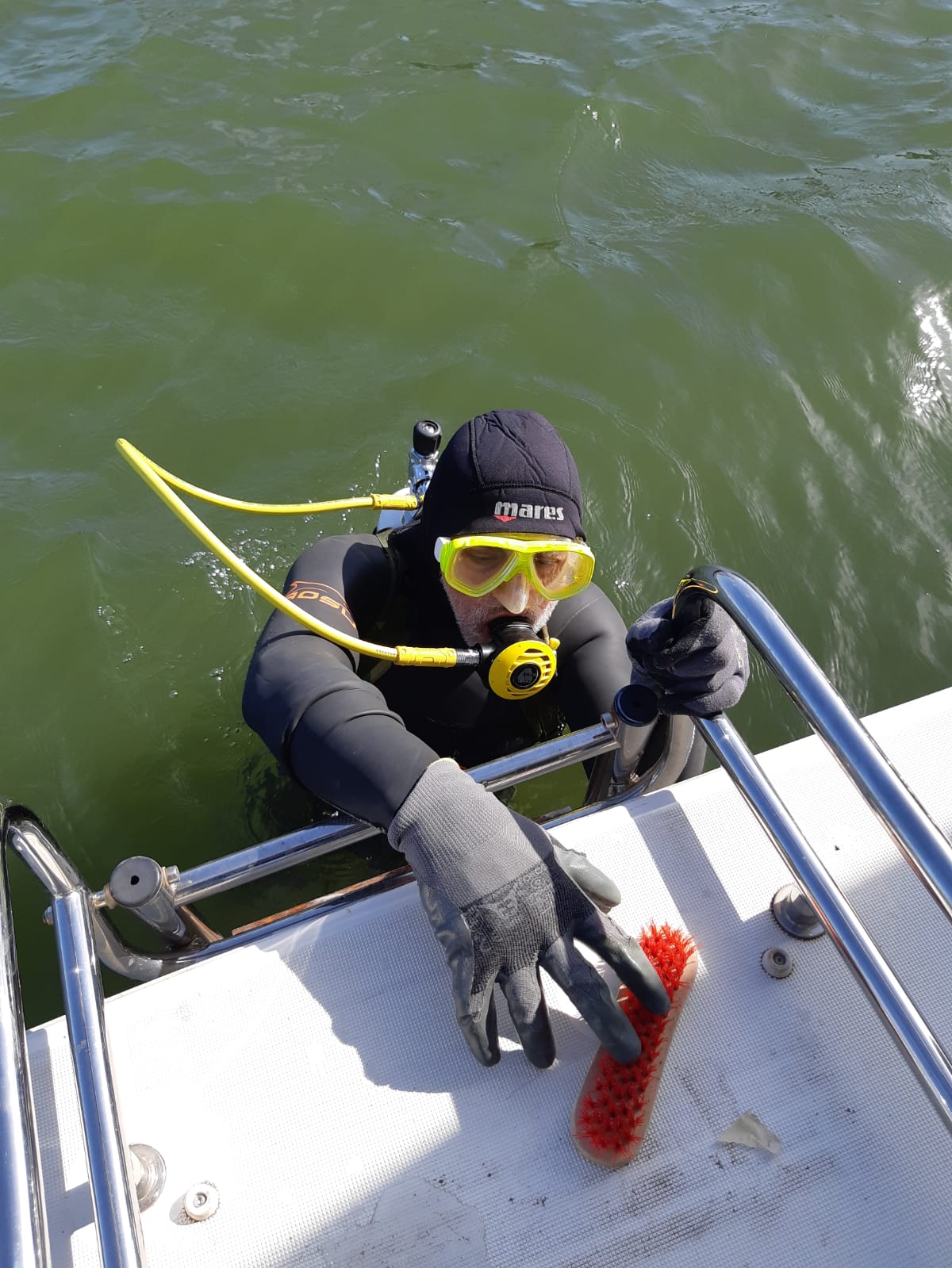 Die Inspektion des Unterwasserschiffes zeigte, dass der Bewuchs aus dem Salzwasser eher weniger geworden ist. Der Impeller des Geschwindigkeitsmessers ist schön frei beweglich. Und "Macken" haben wir nur eine kleine. Ein paar Schleifspuren an beiden Flossen, das war's.