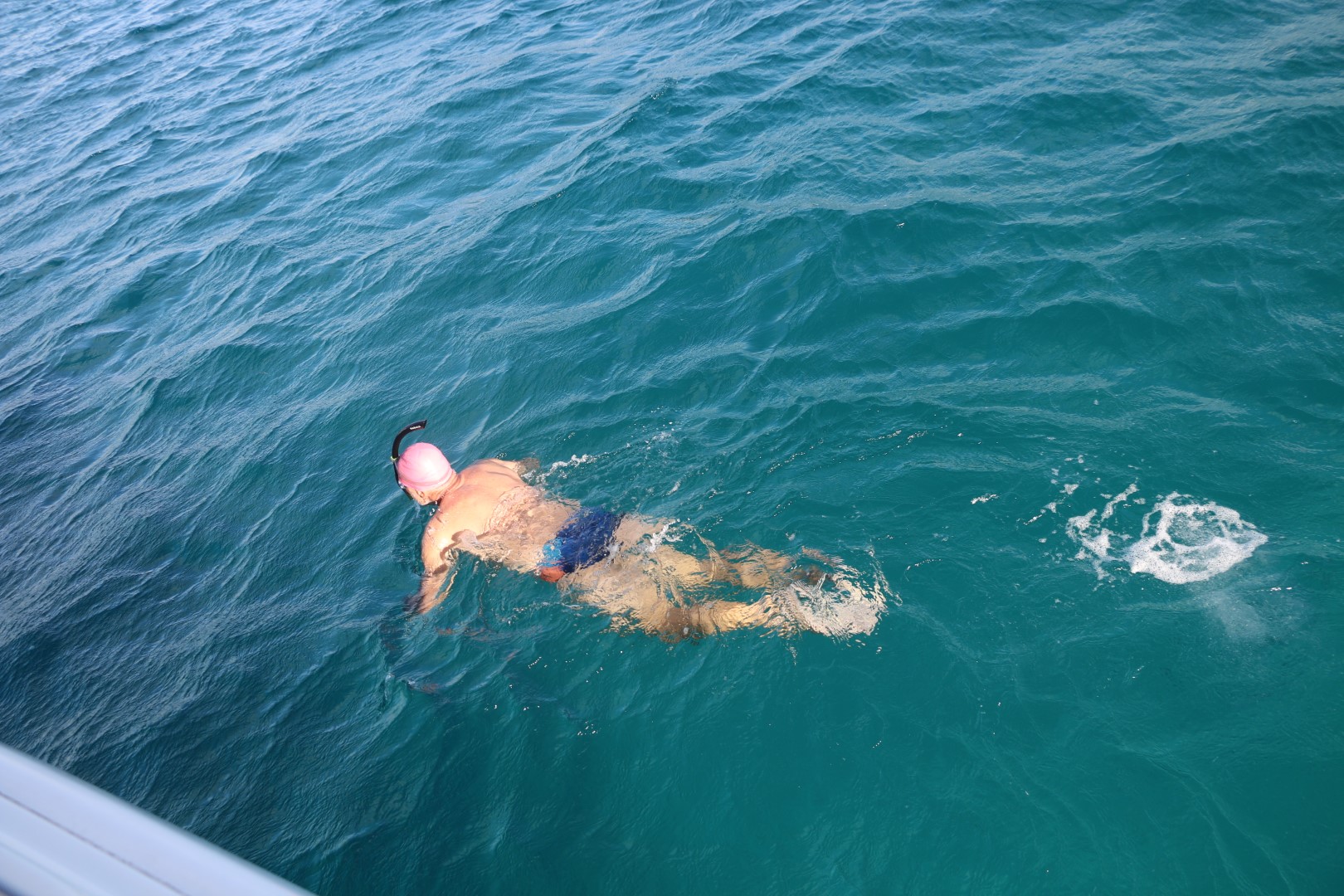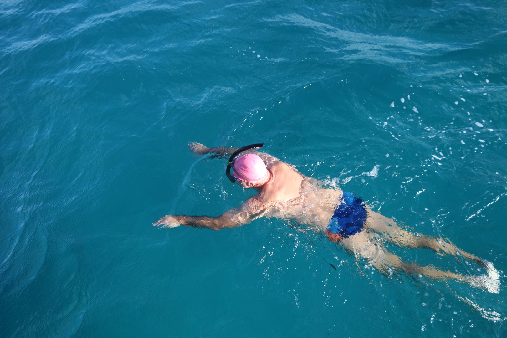 Mit einem Laser-Entfernungsmesser von der achteren Plattform unsere Ankerboje vermessen: 47 Meter. Hin, zurück auf der anderen Bootsseite und dann min. 8 Meter ums Heck rum: Gute 100 Meter pro Runde. Also 30 Runden! In Gran Canaria hatte ich mir noch einen Zentral-Schnorchel geleistet. Das Ding ist super! Denn bei 5 Windstärken hier am Ankerplatz haben wir doch eine krüschelige Welle mit ca. 20 Zentimeter Höhe. Macht das Atmen beim Schwimmen unangenehm. Da kommt oft Wasser mit…. Mit dem Schnorchel habe ich da überhaupt keine Probleme. Michèle gibt nach 5 Runden auf. Ist einfach zu blöde zu schwimmen mit der Welle. Und ich behalte auch zum Brustschwimmen erstmals den Schnorchel an. 20 Runden Kraul, dann immer eine Runde Brust, eine Kraul. Am Ende bin ich sehr zufrieden: 30 geschafft!
