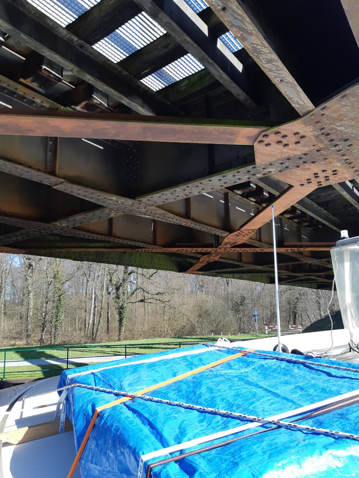 Nun sind wir auf dem (gut) ausgebauten Teil des DEK (Dortmund-Ems-Kanal) angekommen. Hier haben alle Brücken eine Durchfahrtshöhe von min. 5,25 Meter. Das war nur auf der Hinfahrt spannend. Da habe ich dann auf dem Dach gestanden und geschaut, ob ich "cool" genug bin, den Kopf nicht einzuziehen. (Am Anfang war ich eher nicht...)
