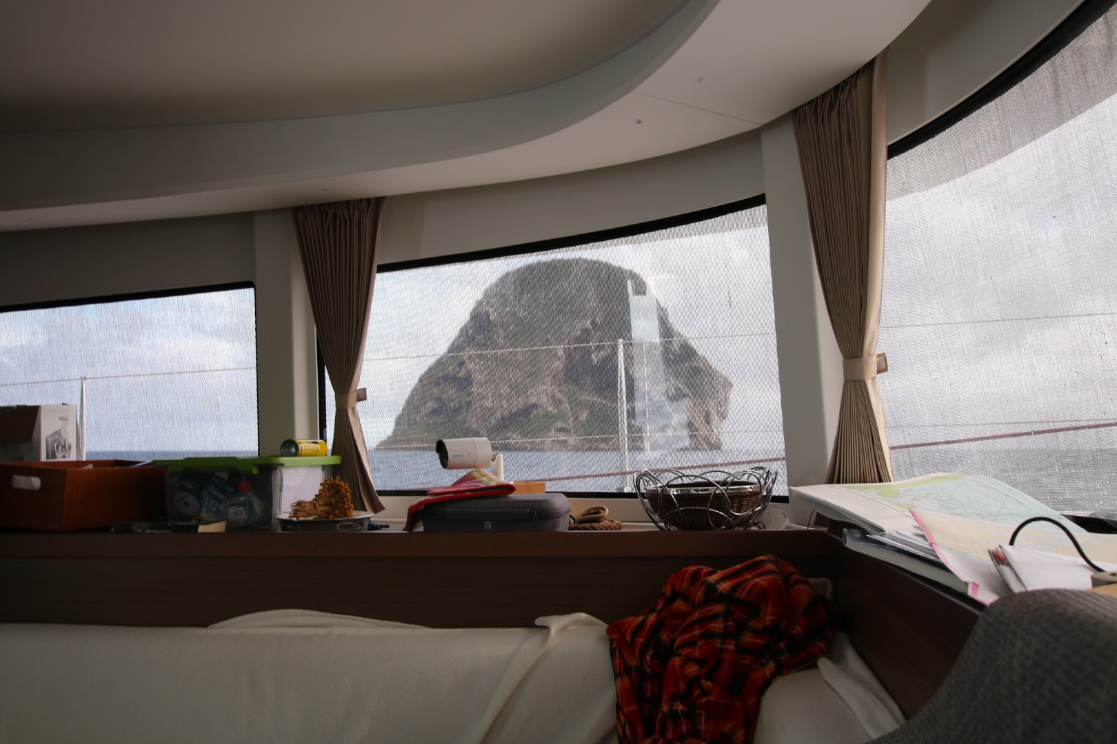 Kaum ist die Fock gesetzt kommt eine ordentliche Regenwalze auf uns zu. Also – auch noch den Rest wasserdicht machen und dann flitzen wir unter Fock auch schon mit fast 7 Knoten durchs Wasser. Schön! Und: Kaum sind wir aus der Bucht, schlägt Michèle vor, noch mal Wasser zu machen. Immer gut. Nebenher backe ich zwei „Milchkapseln“ – ein schönes Weißbrot der Wildbakers. Da muss Michèle das Segeln übernehmen. Und wie üblich macht sie das bei einer zweiten und dritten Regenböe.