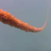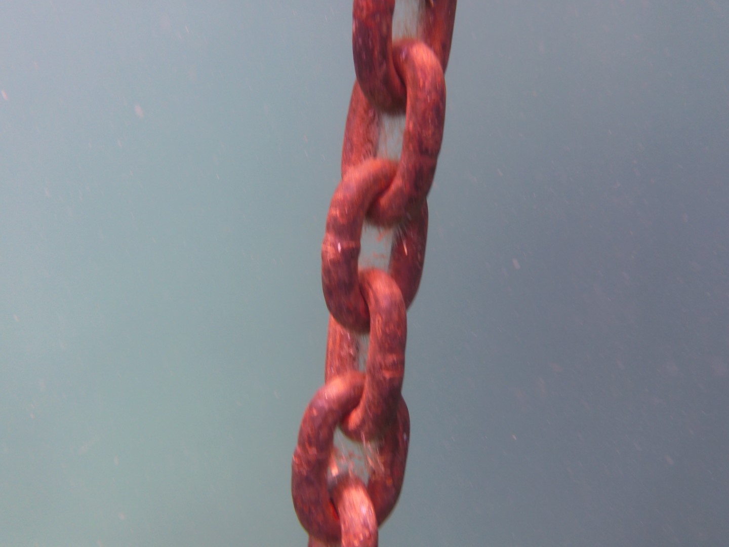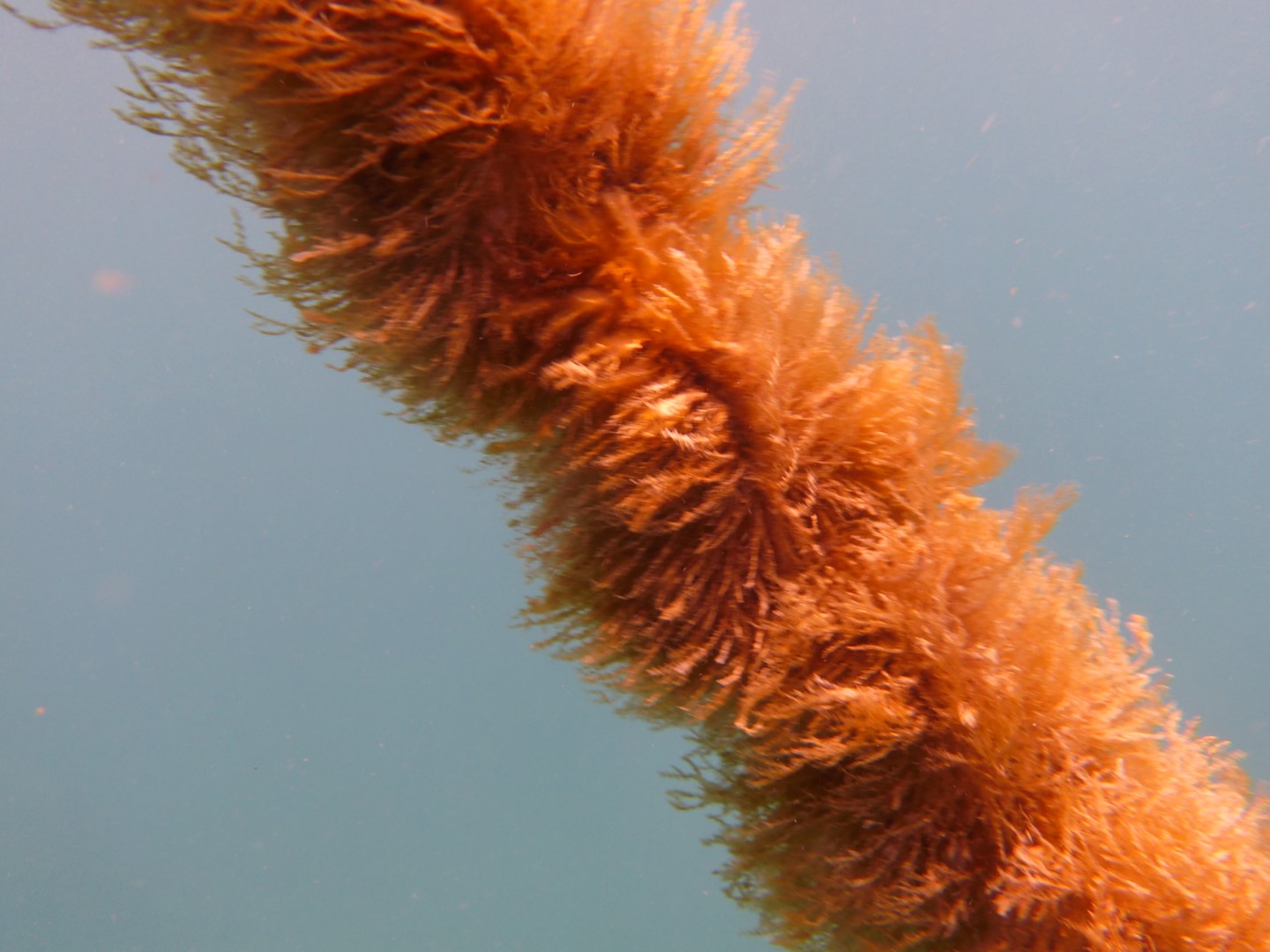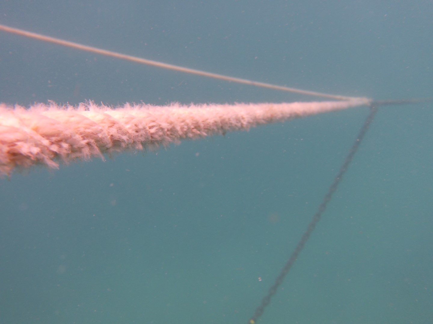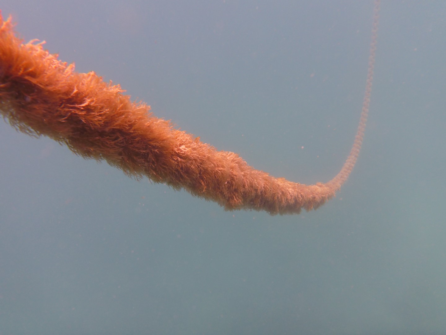 Nachdem ich heute früh die Sonnensegel fertig gesäumt hatte, ging es ins Wasser: Die Tampen des Hahnepots bürsten. Und da bekomm ich einen Schreck! Denn unsere Ankerkette, die ist weg! Also zumindest die ersten Meter, die so gerade mal ins Wasser hängen. Stattdessen eine grau-grüne bis braune Algen-Schlange. So ähnlich sehen die Tampen des Hahnepots aus. Da ist ne Menge Arbeit mit der Bürste zu tun….