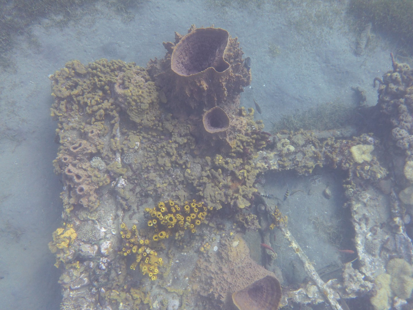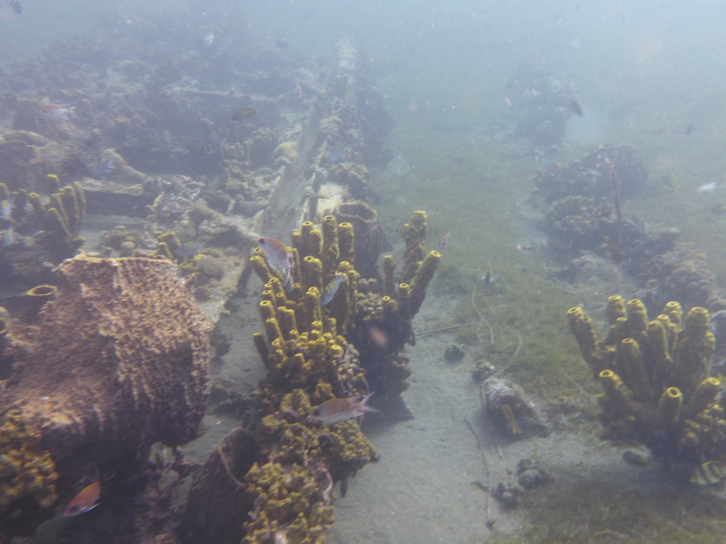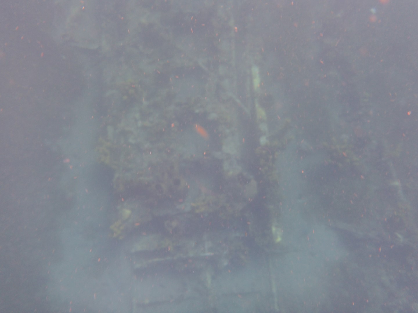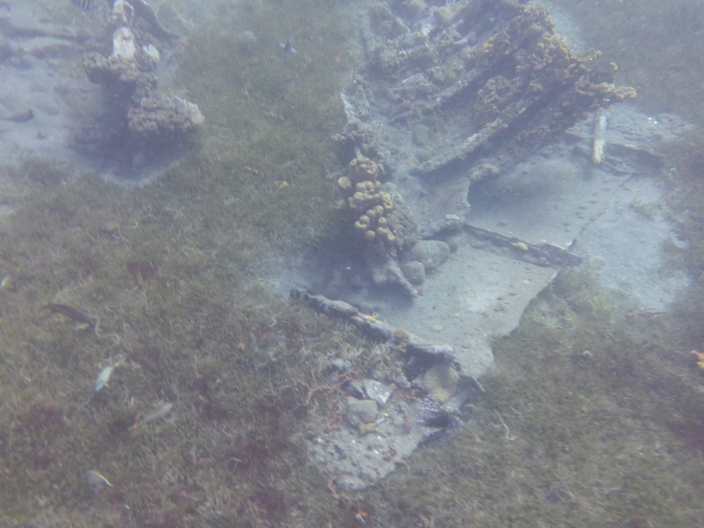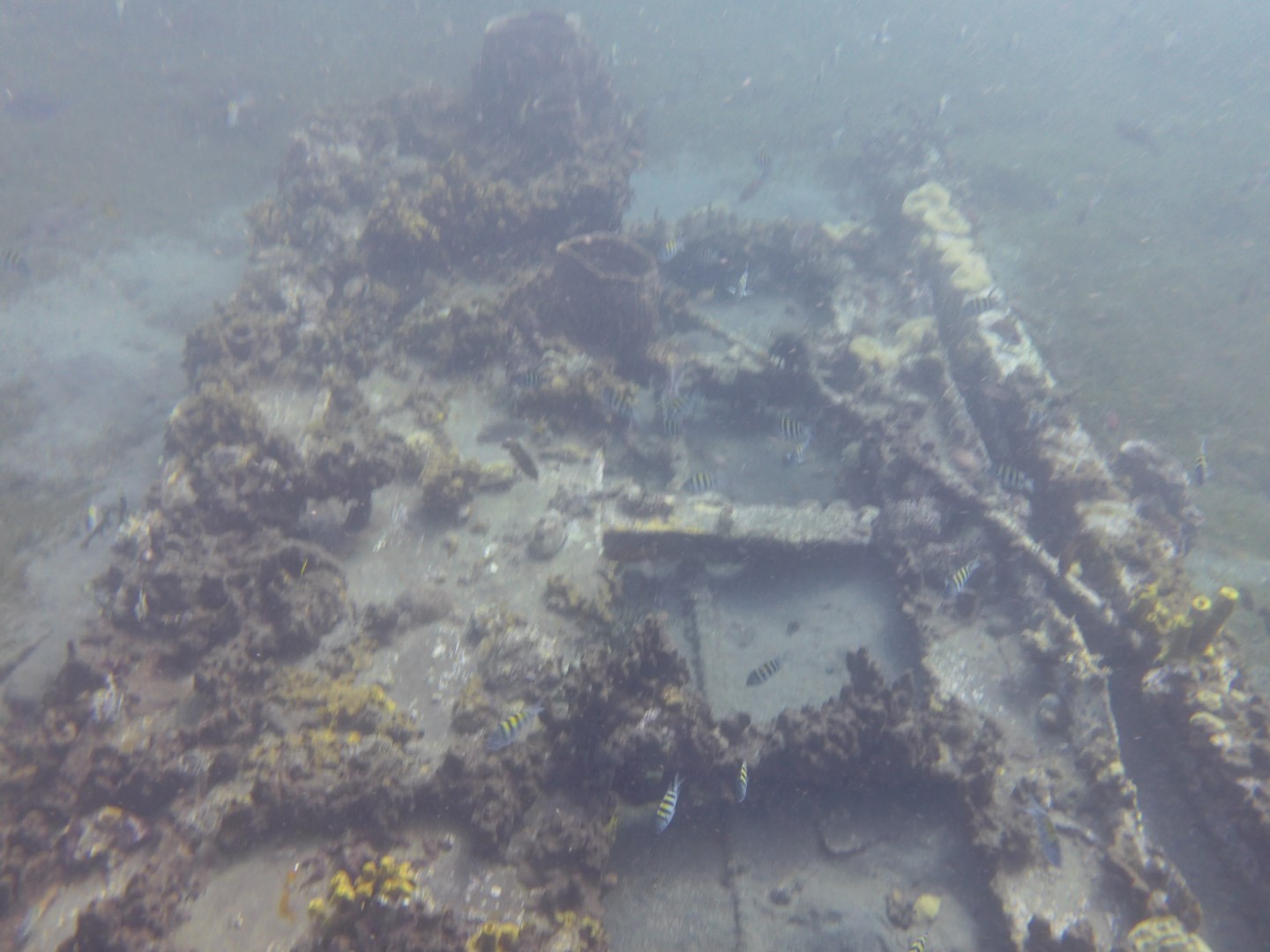 An Bord zurück sehe ich achteraus ein Taucherboot. Das sind knapp 400 Meter. Und was sollten die anderes machen, als ein Wrack betauchen? Kaum sind die weg, schwimme ich hin. Lage peilen, ob es sich lohnt, das Geräte klar zu machen. Es liegt auf etwa 10 Meter – und es lohnt sich, das zu fotografieren. Also zurück, Fotoapparat holen. Hatte ich schon mal meine Dankbarkeit für Coras Tipp mit der Unterwasser-Kamera zum Ausdruck gebracht?