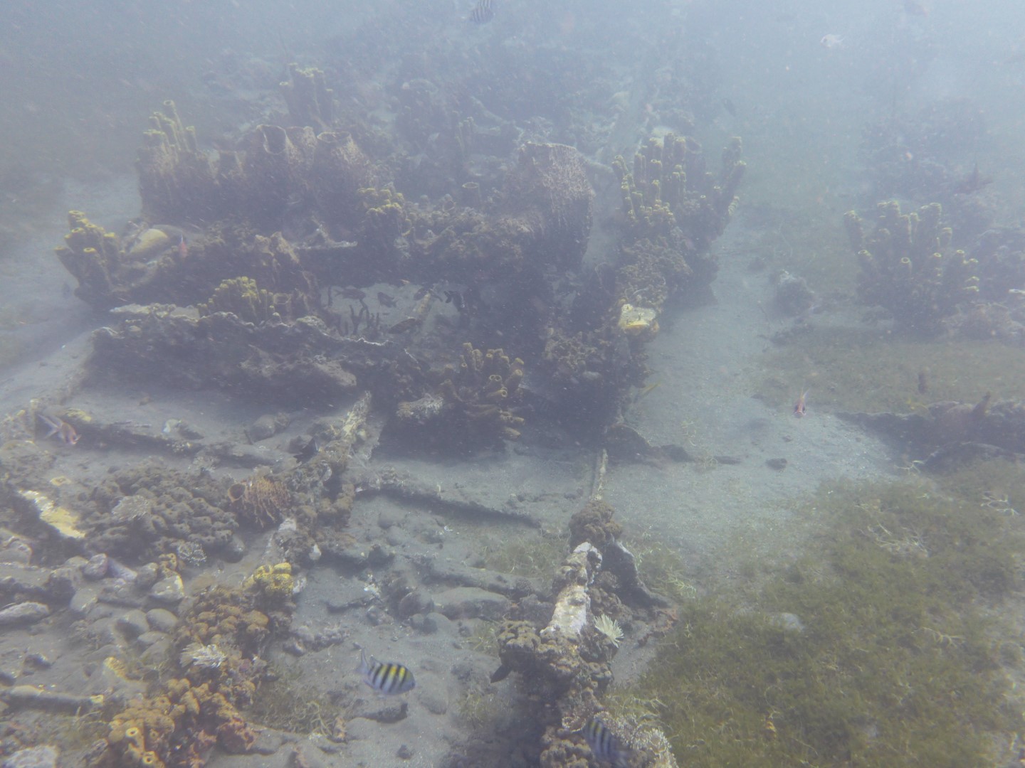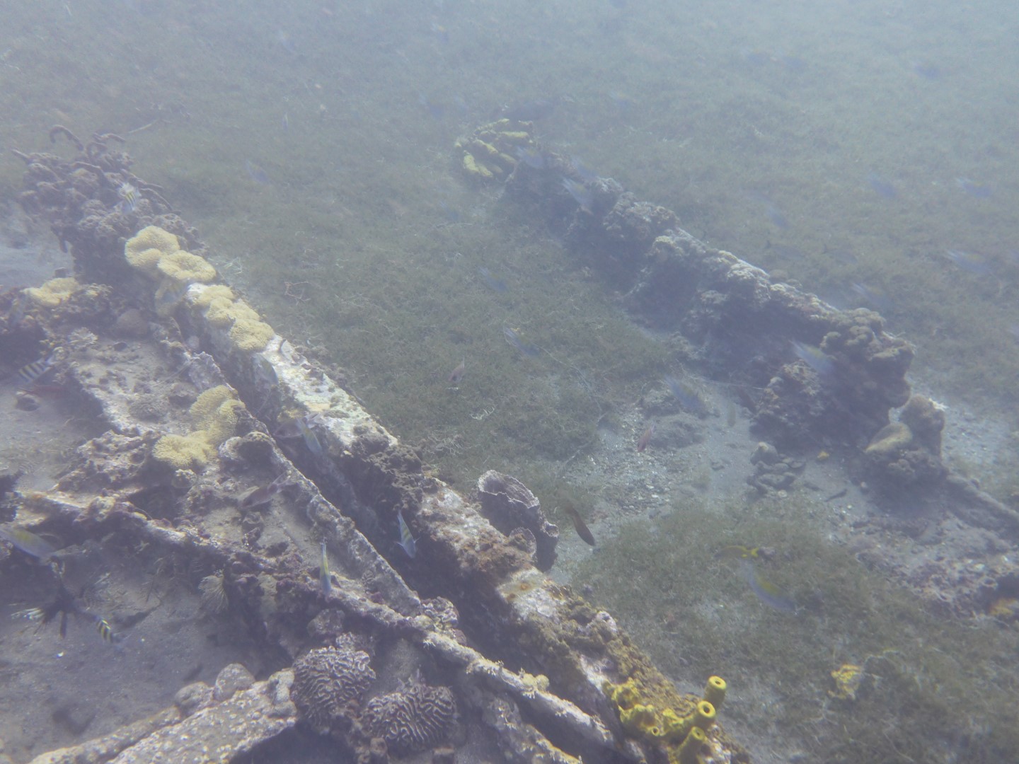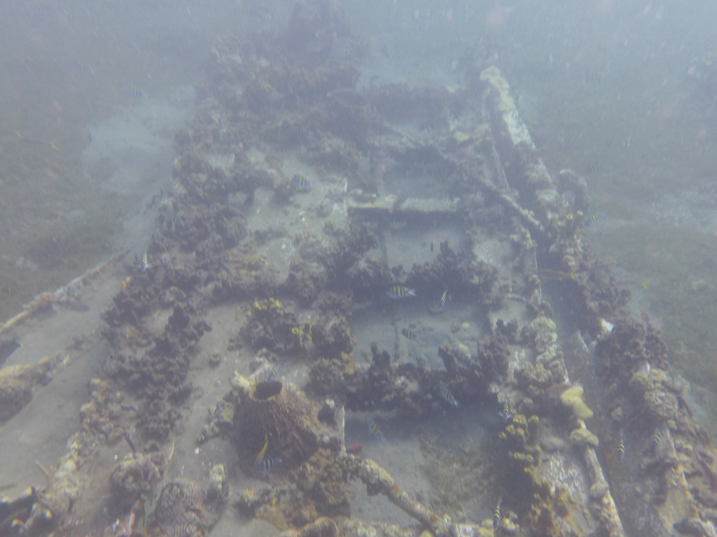 Die Aufnahmen zeigen ein vor 120 Jahren (1902) beim Vulkan-Ausbruch gesunkenes Schiff. Davon liegt die ganze Menge hier in der Bucht. Es hat damals wohl nur ein Schiff den Ausbruch überstanden. Aber ein so versenktes Schiff ist nach 120 Jahren nur noch skelettartig – aber immer noch zu gut zu erkennen.