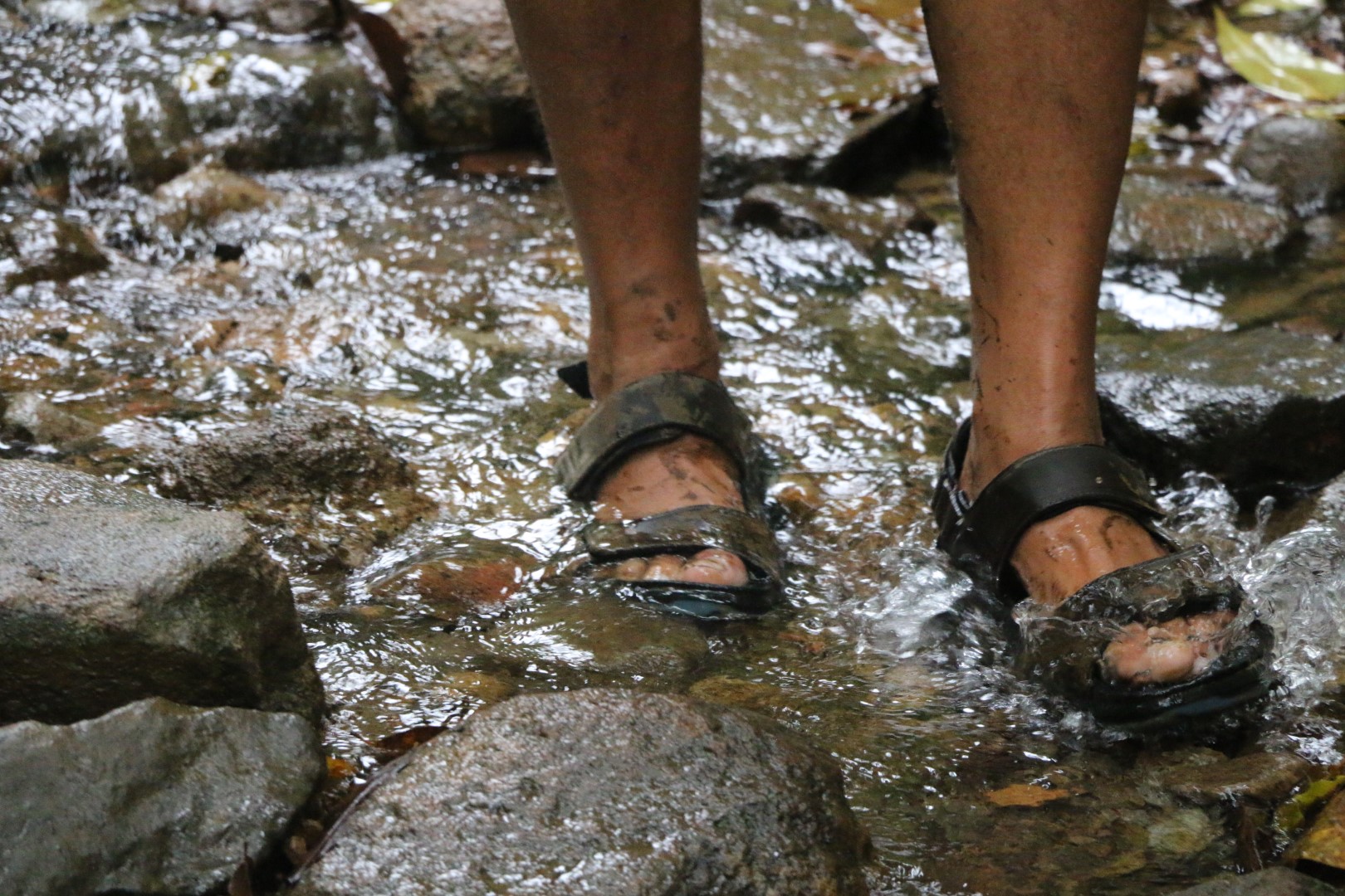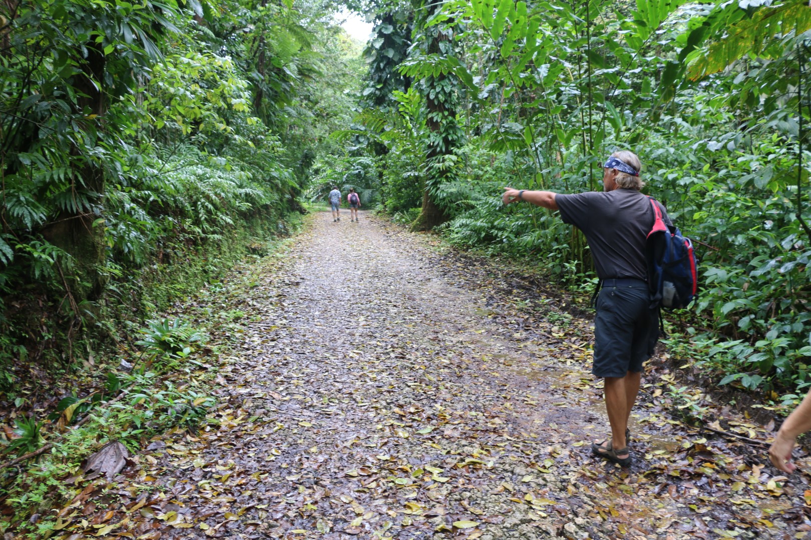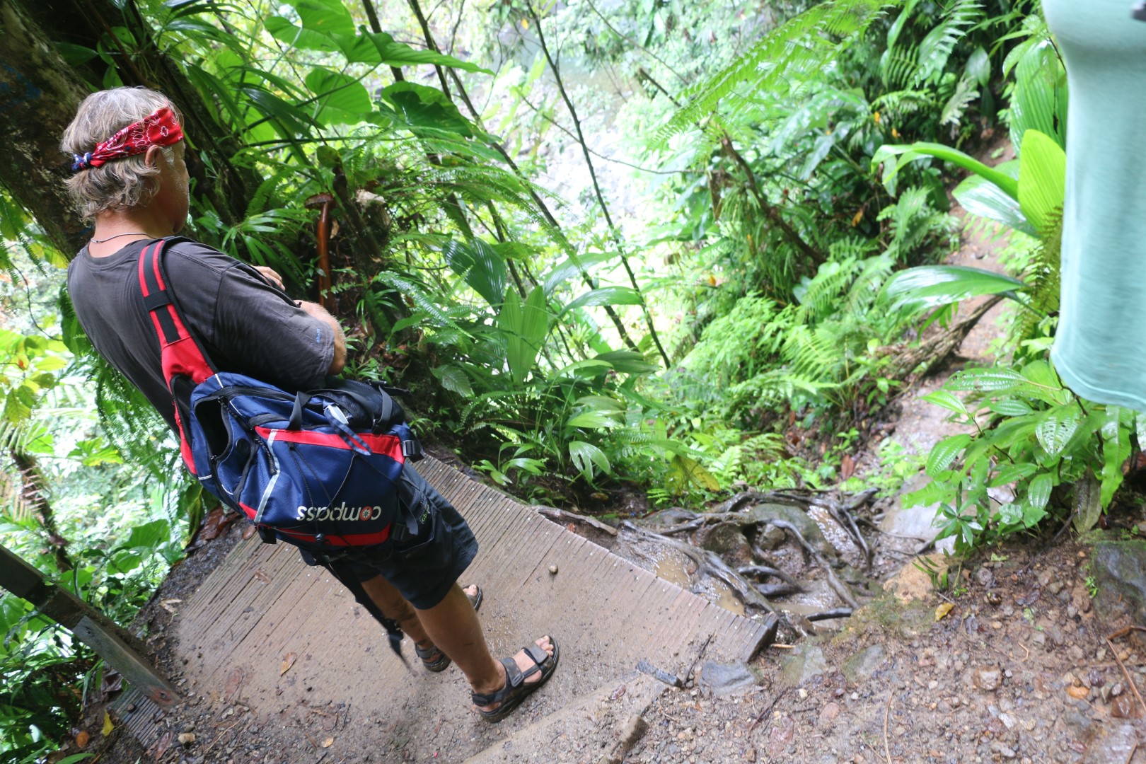 Museen haben hier am Sonntag zu – also beginnen wir mit „Natur“. Zunächst ein Spaziergang im Regenwald zu einem Wasserfall. Was als Schotterpiste beginnt wächst dann zu einem Schlammpfad zusammen. Wobei – es ist im Endeffekt wunderbar „gepflastert“ für die Touris. Teils führen Bohlenstege, die mit Maschendraht gegen Ausrutschen gesichert sind über arge Stellen. Aber – unsere Schuhe werden schon schön schmutzig. Und die Speicherkarten auf den Kameras schön voll. Am Ende stehe ich mit weit mehr als 250 Fotos da, die dann möglichst schnell auf unter 100 gebracht werden müssen.
