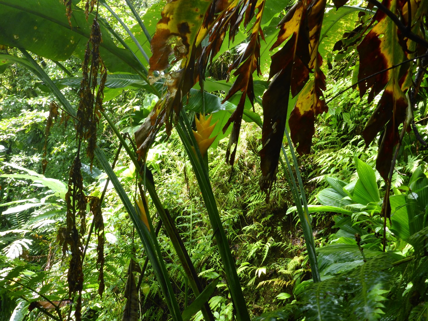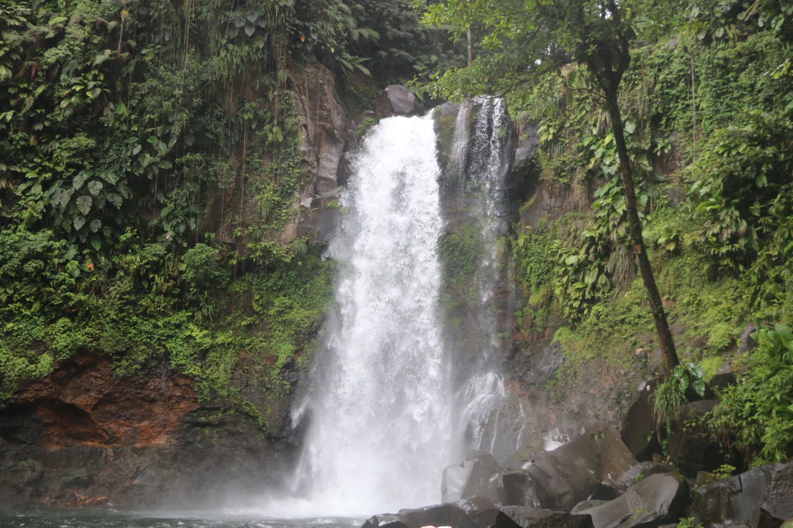 Einige Franzosen haben regenwald-richtige Kleidung an: Badehose, Walking-Stöcke und Turnschuhe. Bei der zweiten Begegnung bin ich gewappnet und kann das dann „einfangen“. Die letzten Meter zum Wasserfall sind verboten: Es geht steil abwärts, ist aber auf den entscheidenden Metern mit einem Tampen gesichert. Unten – wie soll es bei einem Wasserfall anders sein? - recht hohe Luftfeuchte. Zum Baden können wir uns nicht entschließen, es hat deutlich unter 26° Wassertemperatur. Für die 5 Kilometer und 440 Höhenmeter haben wir am Ende dann bald 3 Stunden benötigt. Nun – das waren natürlich die vielen Foto-Stopps!