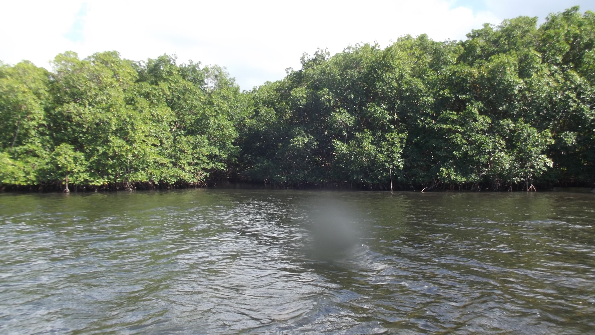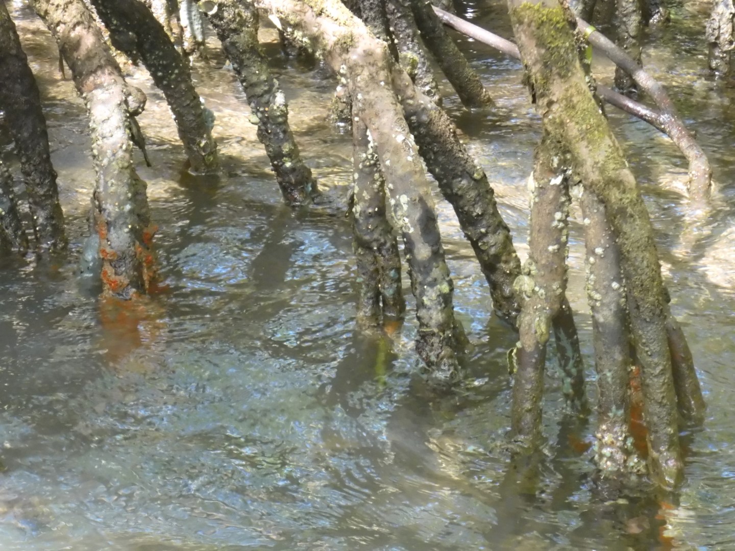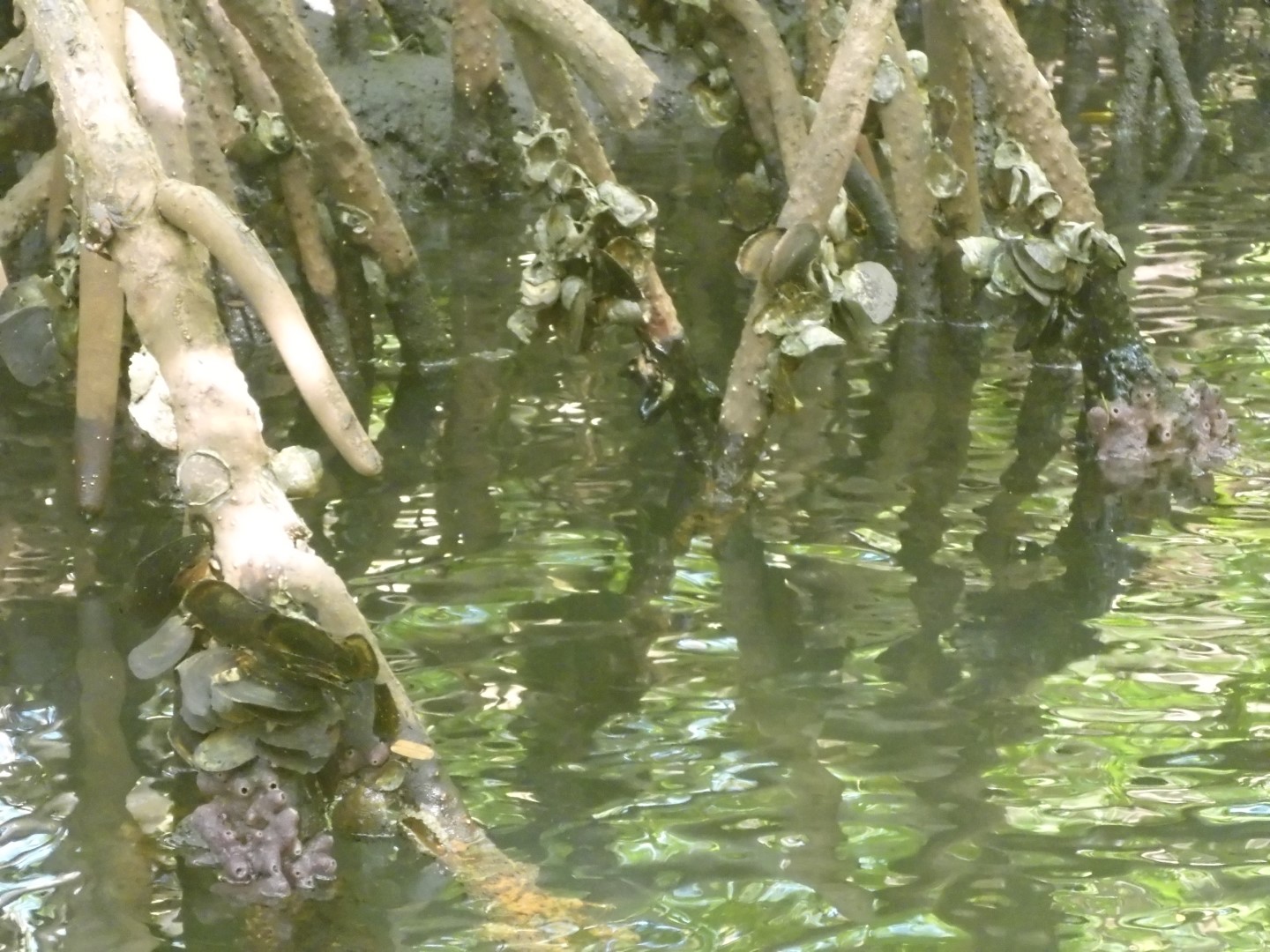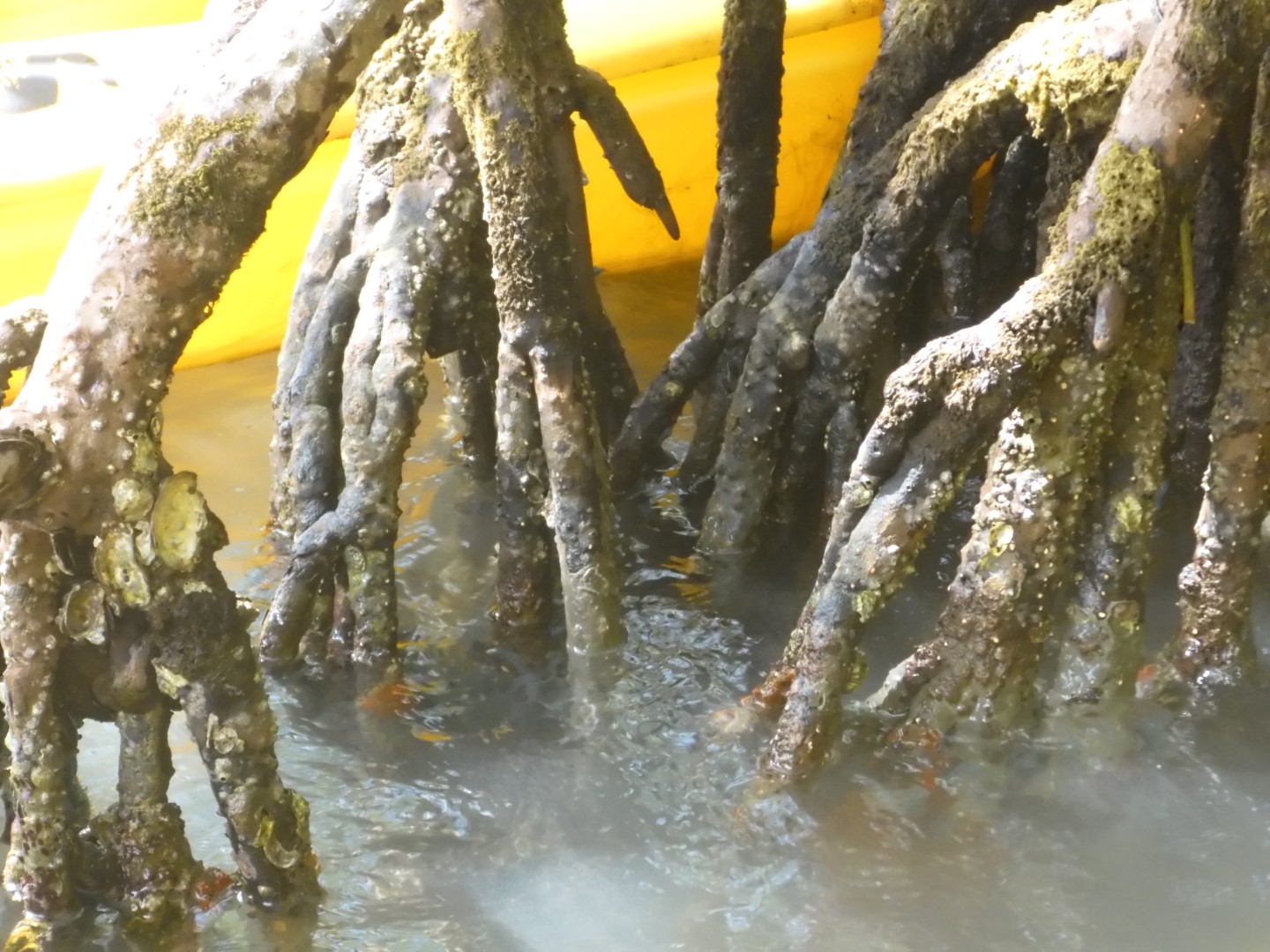 Gegen 14:00 startet die Tour. Es ist eine faszinierende Runde mit vielen neuen Einblicken in diese uns doch eher unbekannte Natur. Und da wir so gut pedalieren, meint Raoul, unser Guide, würde er die Tour etwas erweitern. Uns rinnt jetzt schon der Schweiß aus allen Poren und die Sonne drückt unbarmherzig vom Himmel. Wir befinden uns hier quasi am Scheideweg der Wolken; wir sehen zur einen Seite, landeinwärts, wie sich tiefschwarze Wolken bilden und weiterziehen, über uns jedoch brütet die Sonne und kein Wölkchen bedeckt sie. Was wäre uns jetzt einer der vielen Schauer willkommen! Aber nein! Zu allem Überfluss mussten wir auch noch dicke Schwimmwesten anlegen, welche nicht unbedingt für Kühlung sorgen! Die Tour führt durch einen Tunnel durch den Mangrovenwald, zu einer weit entfernten Insel, wo wir absteigen dürfen und alleine durch einen Tunnel in den Wald waten dürfen. Das Wasser wird dann doch etwas arg tief und keiner hat Badezeug dabei (hat uns Raoul leider nicht mitgeteilt), so dass wir nicht sehr weit laufen. Weiter geht es zu einer Vogelinsel. Hier brüten in den Mangroven irgendwelche Vögel (leider haben wir nicht aufgepasst, so dass ich nicht berichten kann, um welche es sich denn handelt! Es sind diese weißen „Reiher“, die so gerne auf den Kühen stehen. ). Sie haben einen weiten Weg bis an Land, um Nistmaterial und Futter zu besorgen. Trotzdem ist diese Insel für sie am geeignetsten, da sie hier keine Fressfeinde haben: die Mangroveninsel ist noch nicht mit Erde bedeckt, so dass sich keine Katzen, Ratten u.s.w hier aufhalten können. Der Wald ist schon deutlich entlaubter als die Mangroven auf den Nachbarinseln. Der Kot der Vögel ätzt das Laub weg. Und sobald der erste Baum den Geist aufgibt und umfällt, macht sich die ganze Bagage auf und davon und somit hat der Wald wieder die Chance, um sich zu regenerieren.