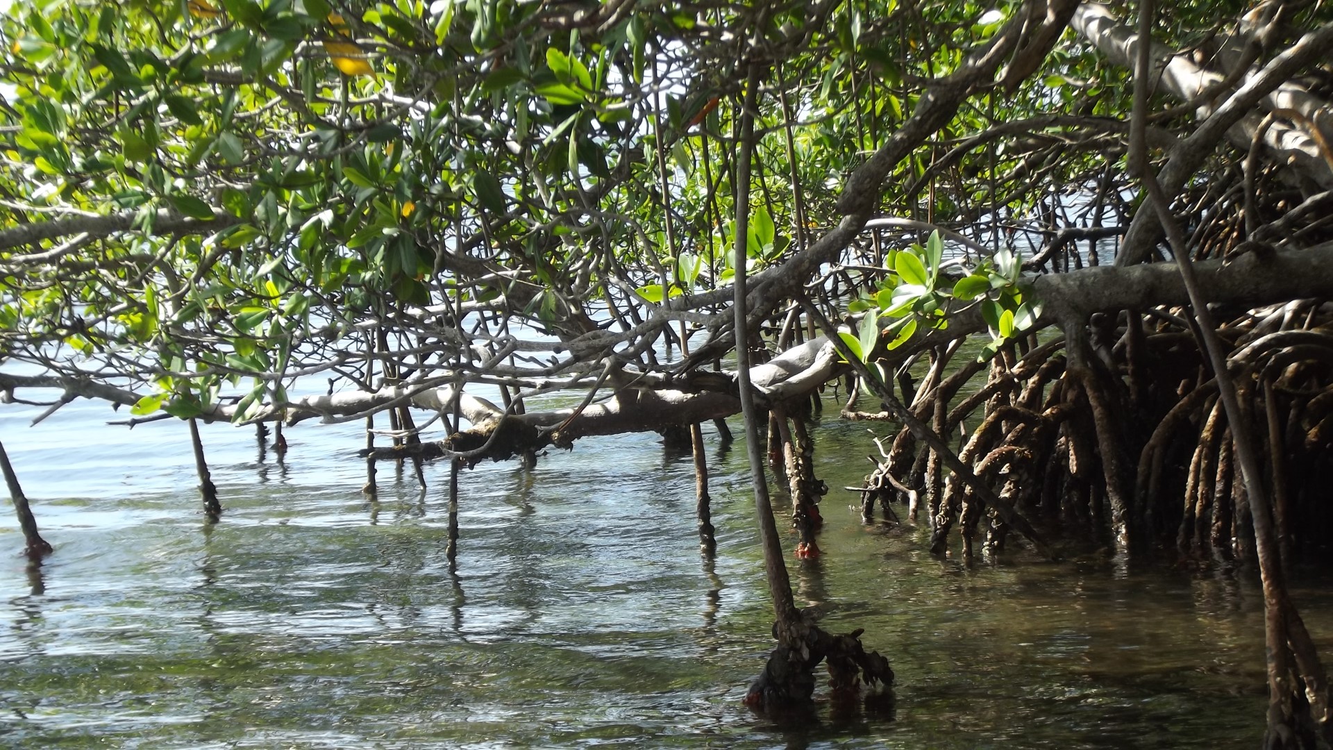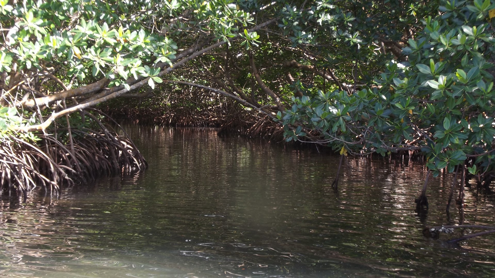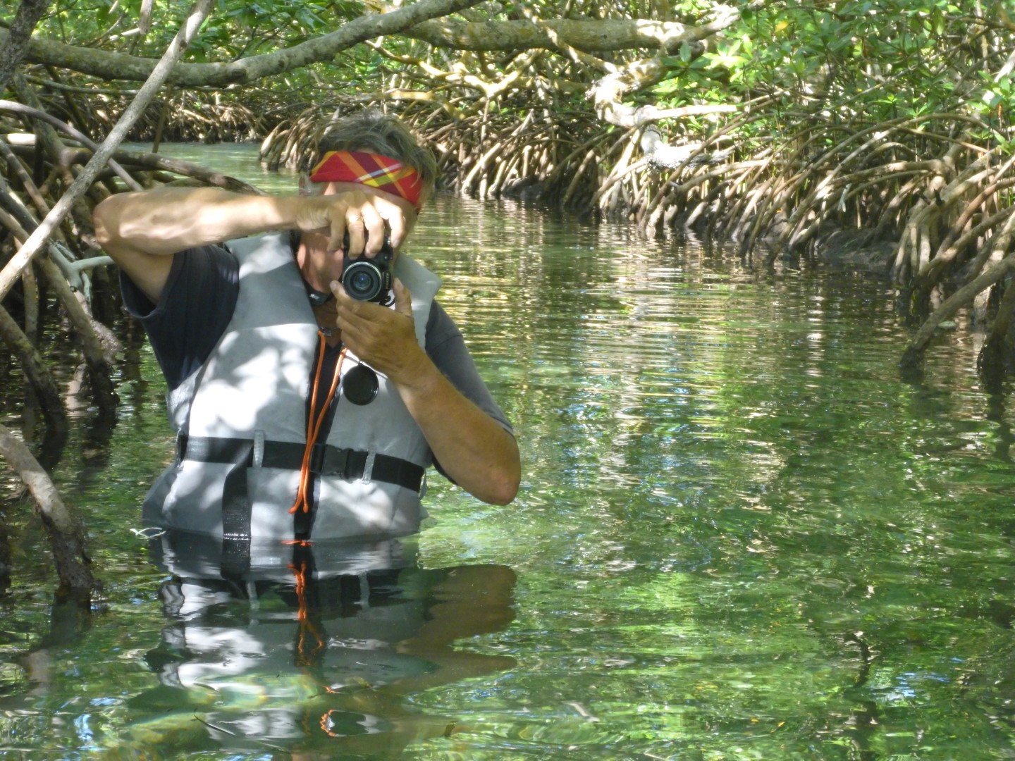 Gegen 14:00 startet die Tour. Es ist eine faszinierende Runde mit vielen neuen Einblicken in diese uns doch eher unbekannte Natur. Und da wir so gut pedalieren, meint Raoul, unser Guide, würde er die Tour etwas erweitern. Uns rinnt jetzt schon der Schweiß aus allen Poren und die Sonne drückt unbarmherzig vom Himmel. Wir befinden uns hier quasi am Scheideweg der Wolken; wir sehen zur einen Seite, landeinwärts, wie sich tiefschwarze Wolken bilden und weiterziehen, über uns jedoch brütet die Sonne und kein Wölkchen bedeckt sie. Was wäre uns jetzt einer der vielen Schauer willkommen! Aber nein! Zu allem Überfluss mussten wir auch noch dicke Schwimmwesten anlegen, welche nicht unbedingt für Kühlung sorgen! Die Tour führt durch einen Tunnel durch den Mangrovenwald, zu einer weit entfernten Insel, wo wir absteigen dürfen und alleine durch einen Tunnel in den Wald waten dürfen. Das Wasser wird dann doch etwas arg tief und keiner hat Badezeug dabei (hat uns Raoul leider nicht mitgeteilt), so dass wir nicht sehr weit laufen. Weiter geht es zu einer Vogelinsel. Hier brüten in den Mangroven irgendwelche Vögel (leider haben wir nicht aufgepasst, so dass ich nicht berichten kann, um welche es sich denn handelt! Es sind diese weißen „Reiher“, die so gerne auf den Kühen stehen. ). Sie haben einen weiten Weg bis an Land, um Nistmaterial und Futter zu besorgen. Trotzdem ist diese Insel für sie am geeignetsten, da sie hier keine Fressfeinde haben: die Mangroveninsel ist noch nicht mit Erde bedeckt, so dass sich keine Katzen, Ratten u.s.w hier aufhalten können. Der Wald ist schon deutlich entlaubter als die Mangroven auf den Nachbarinseln. Der Kot der Vögel ätzt das Laub weg. Und sobald der erste Baum den Geist aufgibt und umfällt, macht sich die ganze Bagage auf und davon und somit hat der Wald wieder die Chance, um sich zu regenerieren.