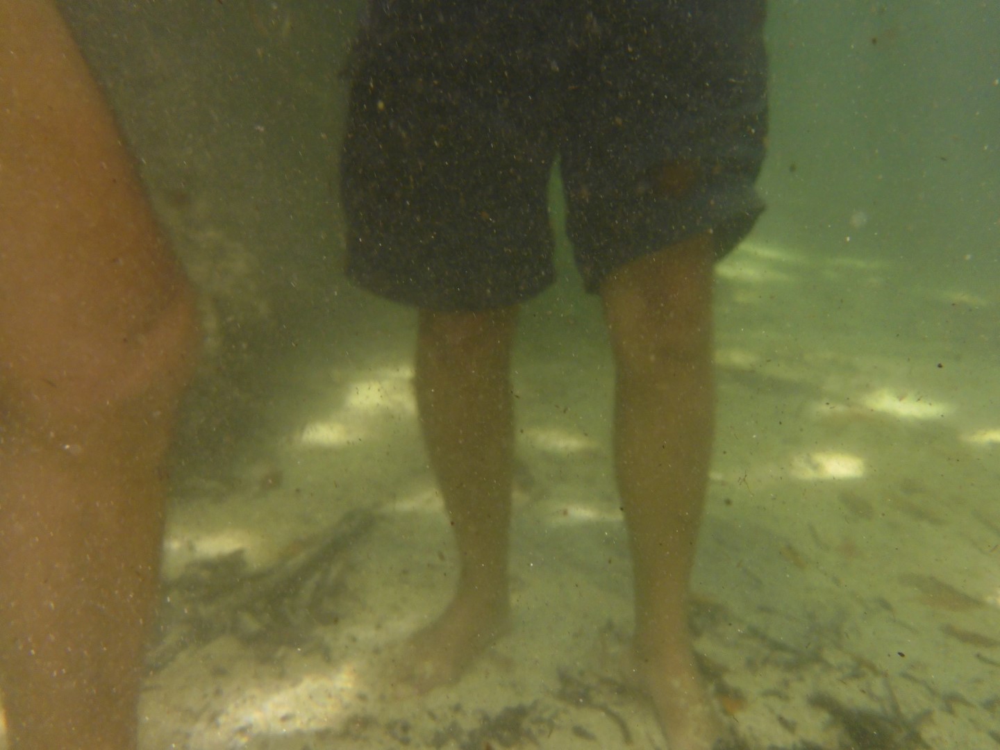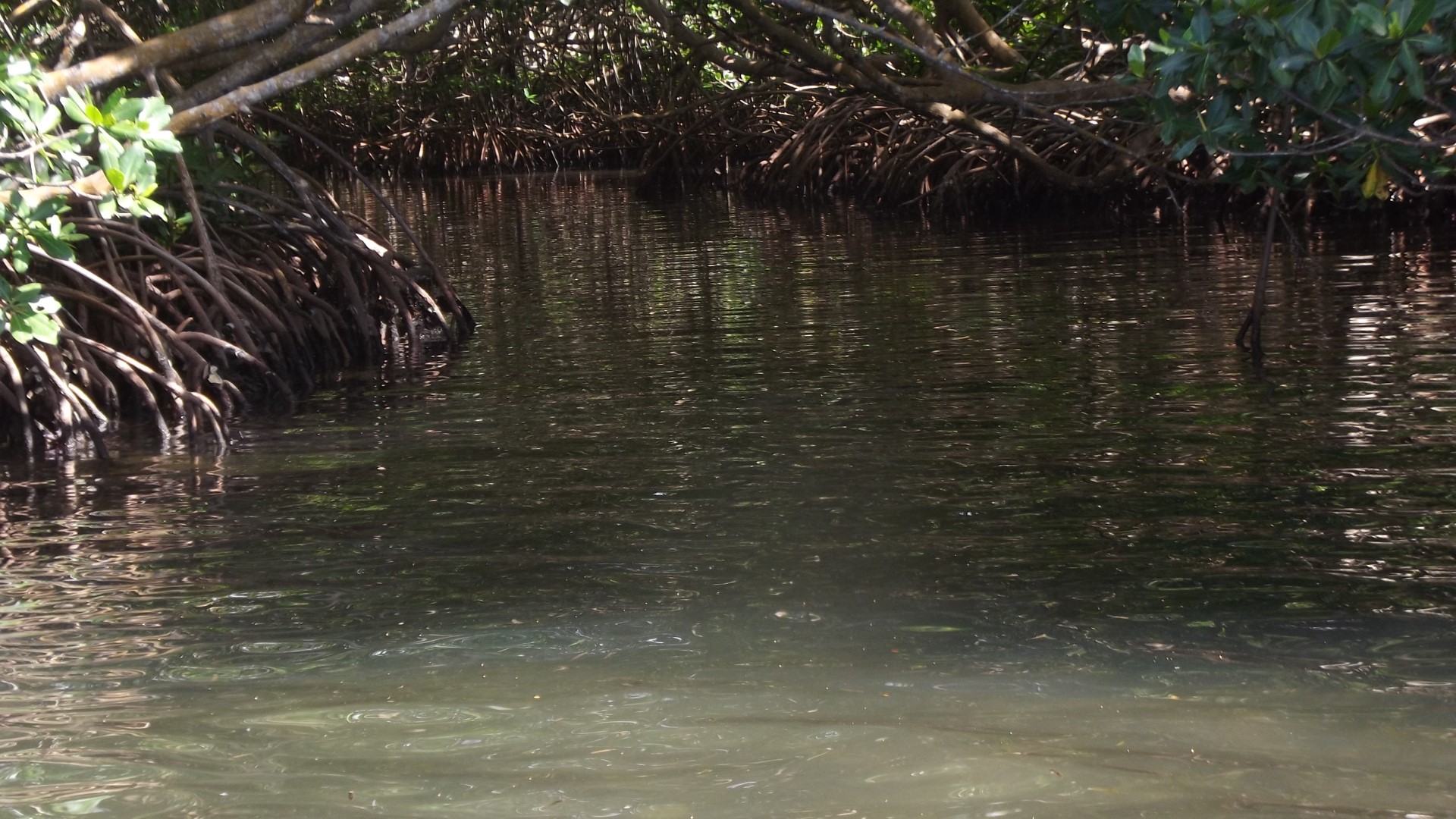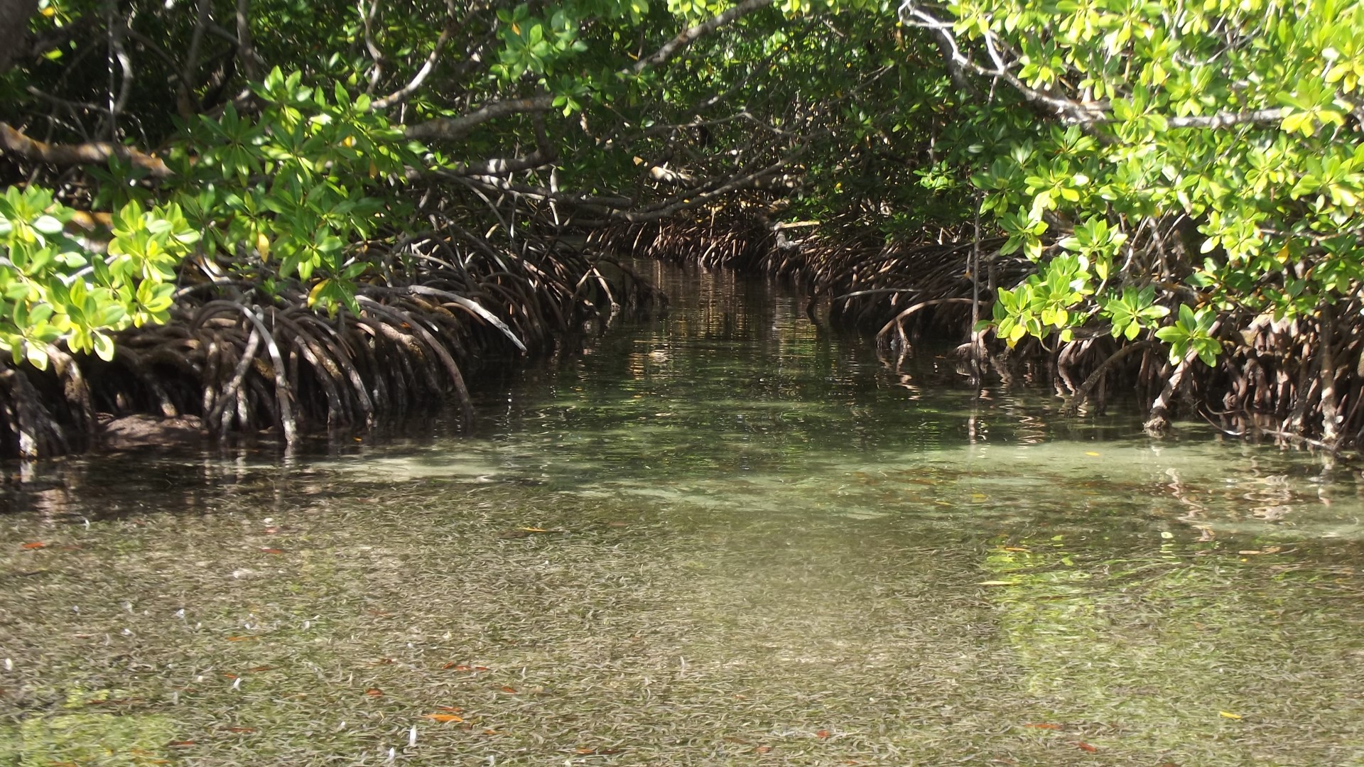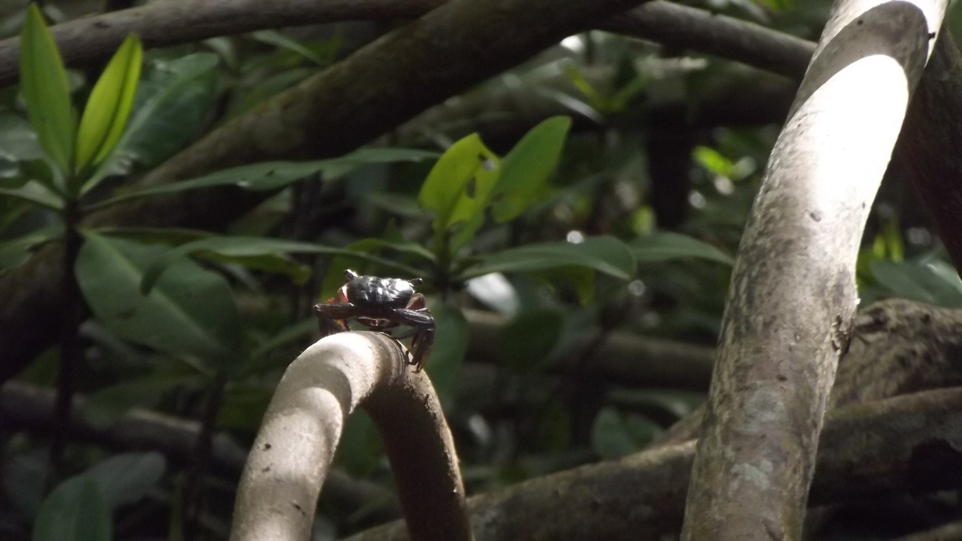 Gegen 14:00 startet die Tour. Es ist eine faszinierende Runde mit vielen neuen Einblicken in diese uns doch eher unbekannte Natur. Und da wir so gut pedalieren, meint Raoul, unser Guide, würde er die Tour etwas erweitern. Uns rinnt jetzt schon der Schweiß aus allen Poren und die Sonne drückt unbarmherzig vom Himmel. Wir befinden uns hier quasi am Scheideweg der Wolken; wir sehen zur einen Seite, landeinwärts, wie sich tiefschwarze Wolken bilden und weiterziehen, über uns jedoch brütet die Sonne und kein Wölkchen bedeckt sie. Was wäre uns jetzt einer der vielen Schauer willkommen! Aber nein! Zu allem Überfluss mussten wir auch noch dicke Schwimmwesten anlegen, welche nicht unbedingt für Kühlung sorgen! Die Tour führt durch einen Tunnel durch den Mangrovenwald, zu einer weit entfernten Insel, wo wir absteigen dürfen und alleine durch einen Tunnel in den Wald waten dürfen. Das Wasser wird dann doch etwas arg tief und keiner hat Badezeug dabei (hat uns Raoul leider nicht mitgeteilt), so dass wir nicht sehr weit laufen. Weiter geht es zu einer Vogelinsel. Hier brüten in den Mangroven irgendwelche Vögel (leider haben wir nicht aufgepasst, so dass ich nicht berichten kann, um welche es sich denn handelt! Es sind diese weißen „Reiher“, die so gerne auf den Kühen stehen. ). Sie haben einen weiten Weg bis an Land, um Nistmaterial und Futter zu besorgen. Trotzdem ist diese Insel für sie am geeignetsten, da sie hier keine Fressfeinde haben: die Mangroveninsel ist noch nicht mit Erde bedeckt, so dass sich keine Katzen, Ratten u.s.w hier aufhalten können. Der Wald ist schon deutlich entlaubter als die Mangroven auf den Nachbarinseln. Der Kot der Vögel ätzt das Laub weg. Und sobald der erste Baum den Geist aufgibt und umfällt, macht sich die ganze Bagage auf und davon und somit hat der Wald wieder die Chance, um sich zu regenerieren.