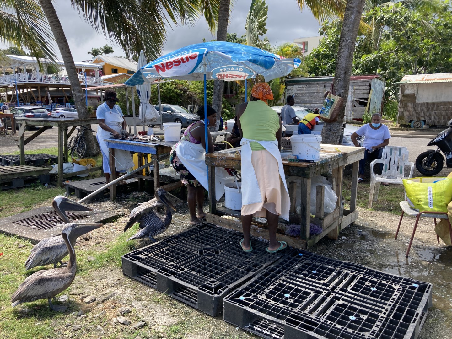 Vormittags steht nichts Großartiges mehr auf dem Programm. Baumarktbesuch, durch Sainte-Rose schlendern, den Fischern zuschauen, wie Netze repariert werden, Fischreste an Pelikane verfüttert werden und leider auch, wie Beifang aus einem kleinen Fischerboot wieder zurück ins Meer befördert wird. Es sind 3 fast 1 m lange Fische, die schon tot sind und ins Meer zurückgeworfen werden.