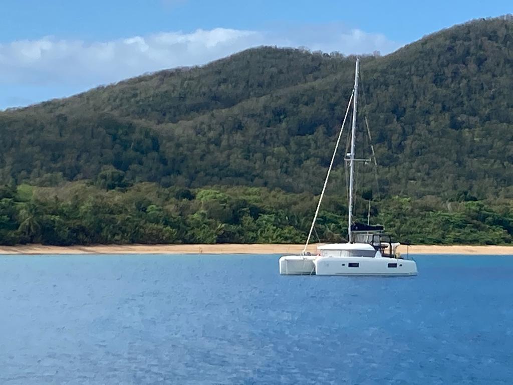 Yoshi hat sich für 4 Tage dorthin verholt und nach 4 fehlgeschlagenen Ankerversuchen vor Ort, hat er sich, wie so viele andere auch, an eine Mooring gelegt. Diese sollte 20,- €/Tag kosten, was schon recht happig ist. Also verhandelt er mit dem Geldeintreiber und kann 4 Tage für insgesamt 20,- € dort liegen! Yoshi verlegt an dem selben Tag wie wir nach Grande Anse. Gleich vorne an der Ecke, im tiefen Wasser liegt eine große alte Yacht (hat noch 2 Schornsteine, ob die allerdings noch in Gebrauch sind oder nur Deko, weiß ich nicht) unter englischer Flagge.