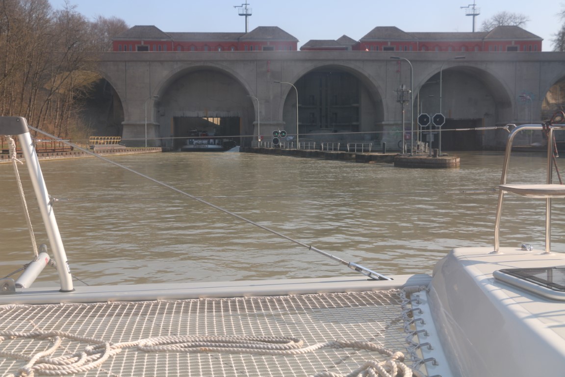 Schleuse Anderten - das letzte Mal bergauf. Gleich 14,7 Meter, das heißt Leinen umsetzen im Akkord. Vorne ein, zwei Poller höher legen, dann ein wenig nach achtern verholen und da dann das Gleiche. Und - zack - schnell wieder ein paar Meter nach vorne verholen. Und das Spiel beginnt von vorn....