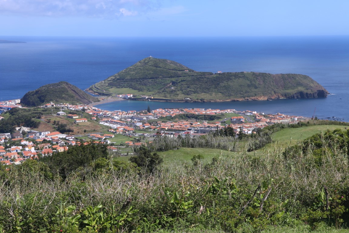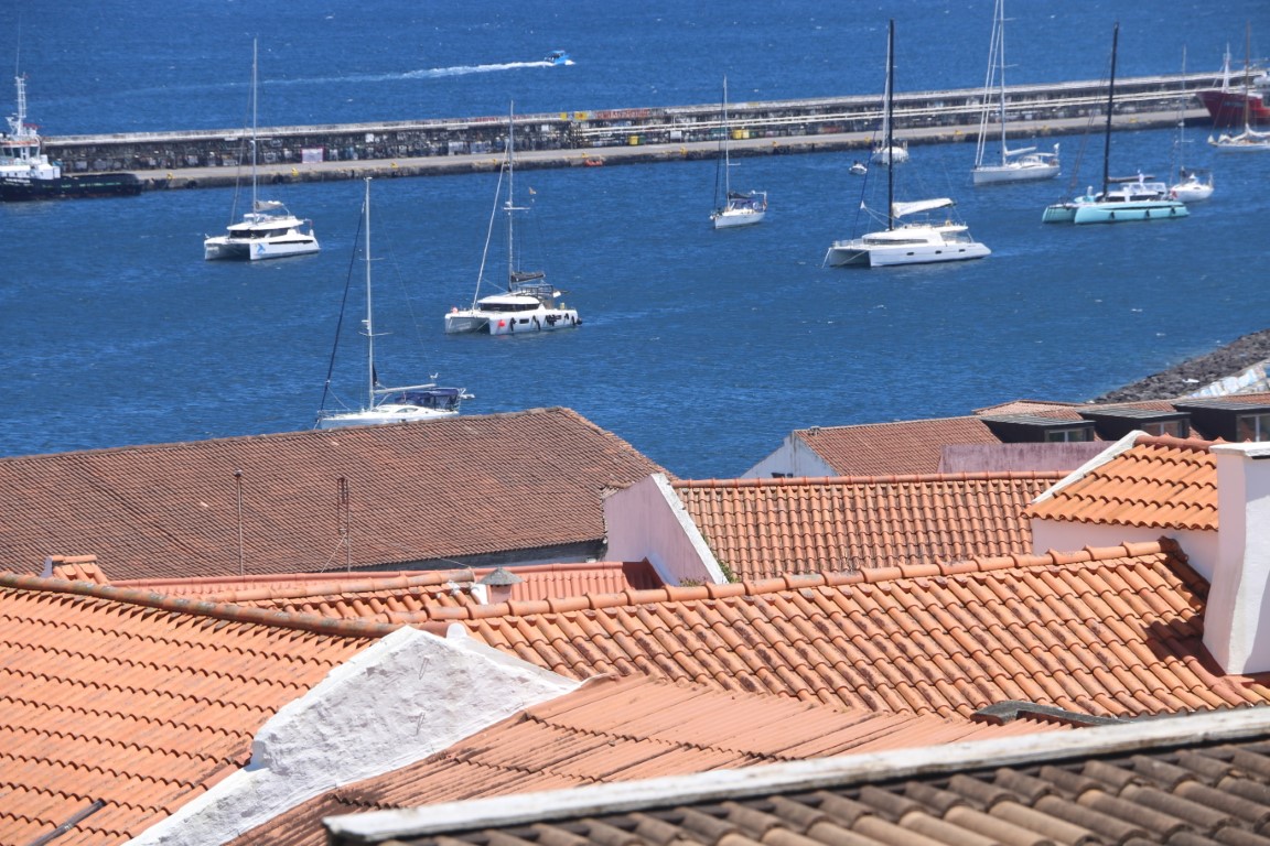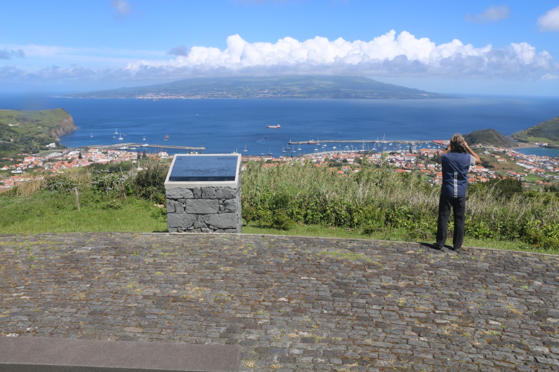 Oben werden wir mit einem prima Ausblick auf Pico – die Insel und den Berg, der der höchste Portugals ist. Dazu dann der Blick auf Horta und den Hafen. Eifrig suchen wir die DaYo und die Re. Jo! Sind noch da! Ein Tanker nimmt Anker auf und läuft ab. Nein – fährt einen großen Bogen und kommt in den Hafen.