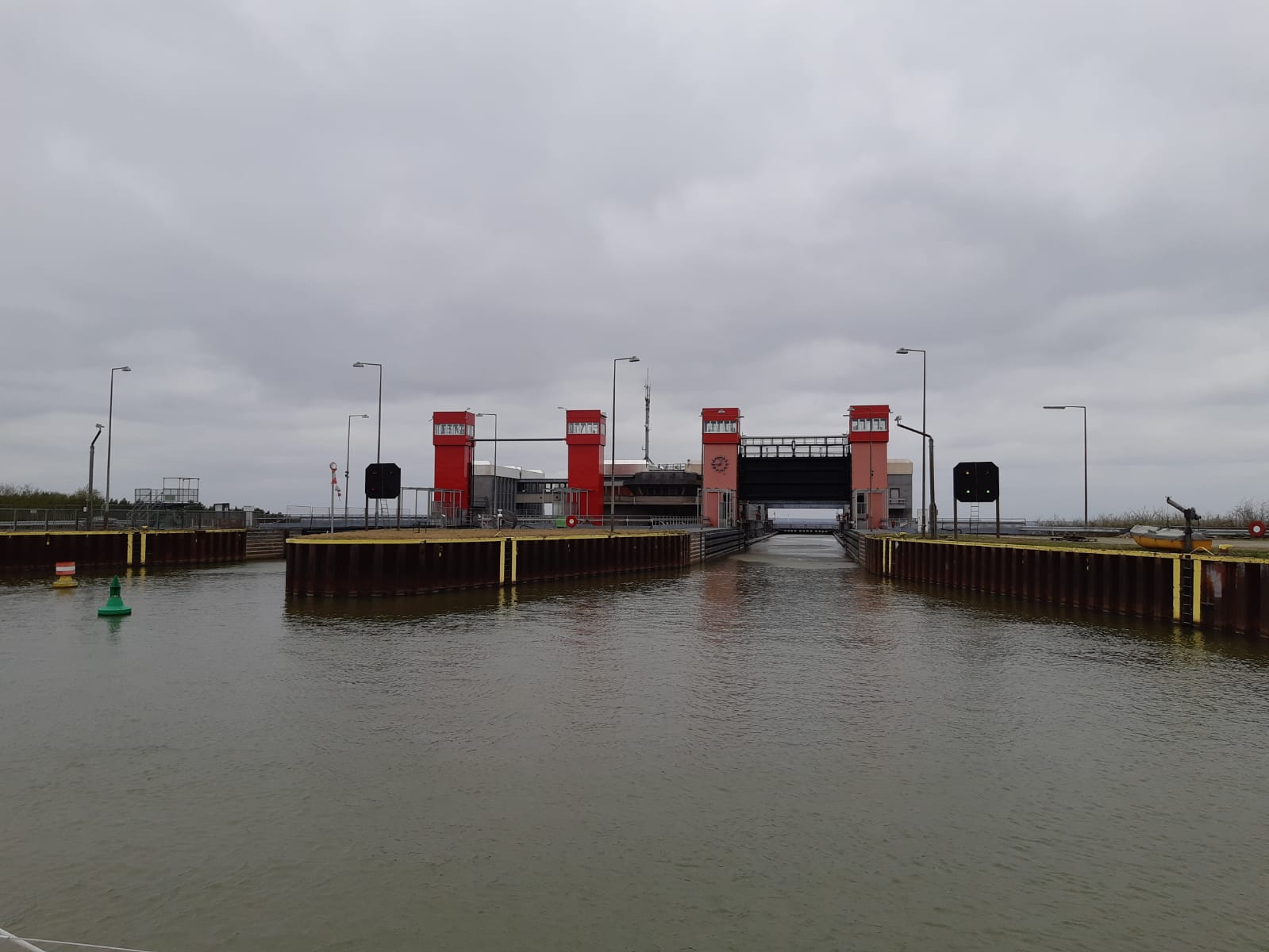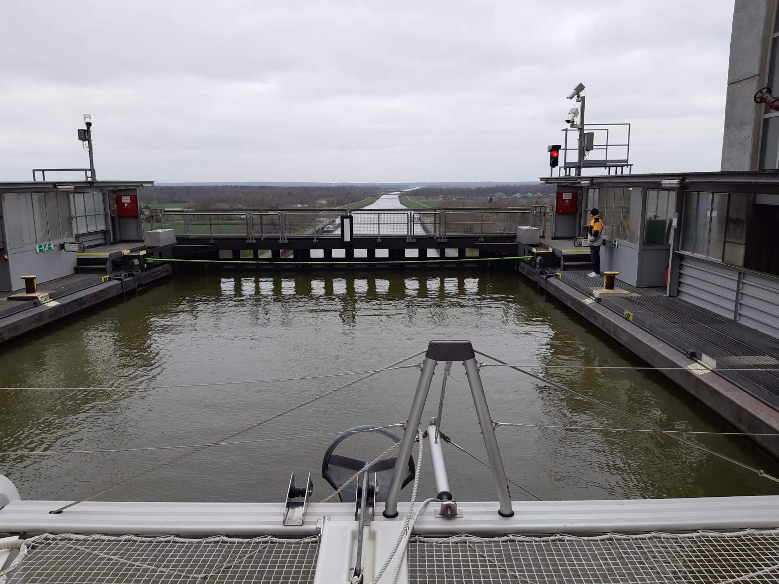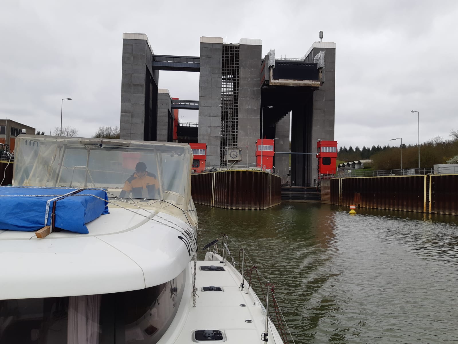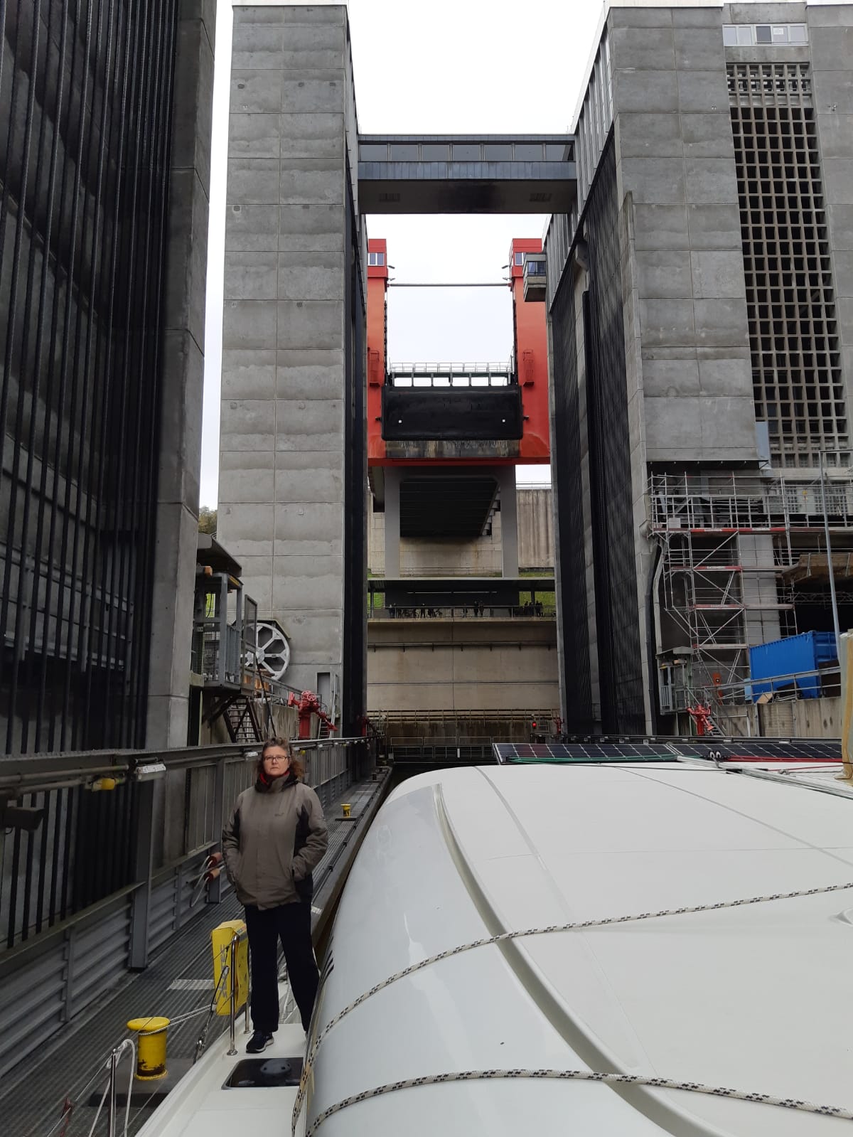 Und so ein Hebewerk ist schön: Reinfahren, saubere Anleger, keine nasse Wand. Da der ganze Trog runter gefahren wird, müssen die Leinen nicht umgelegt werden. Man kann die ganze Sache einfach nur genießen.