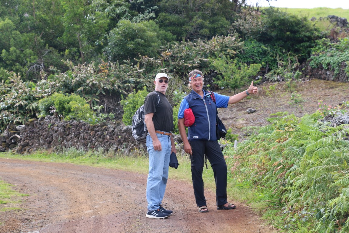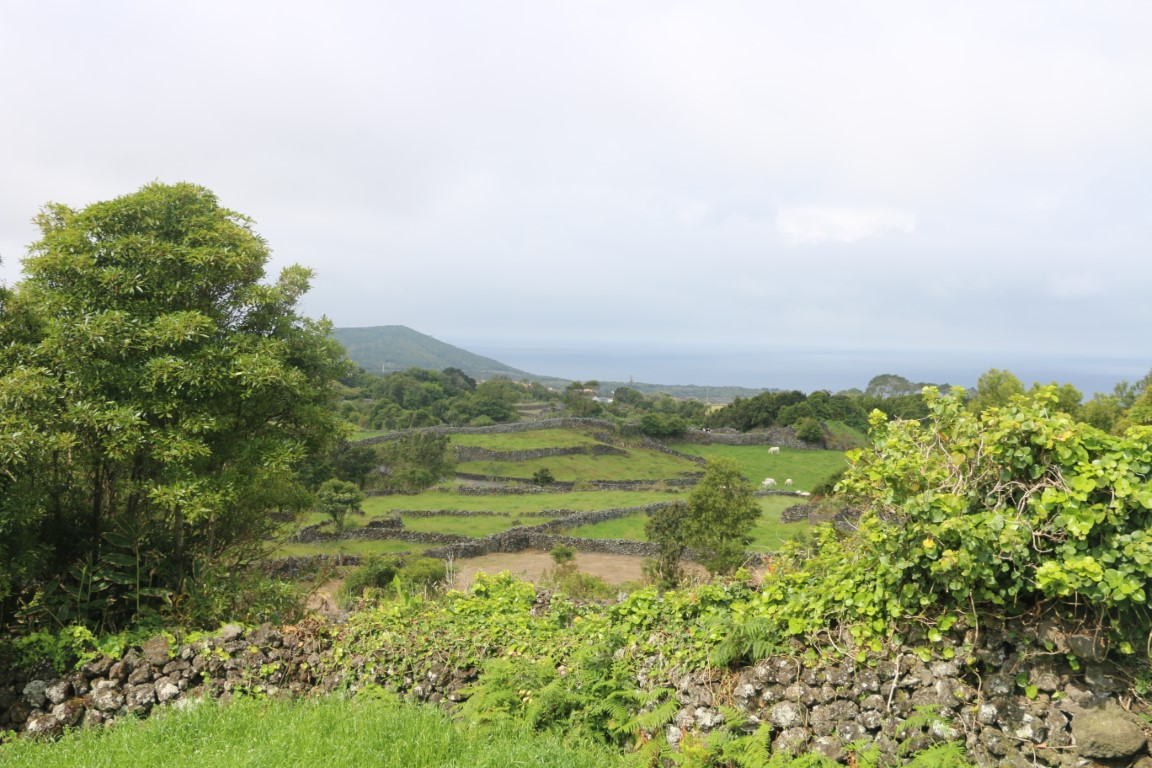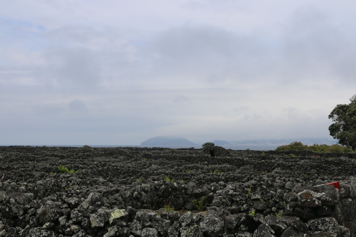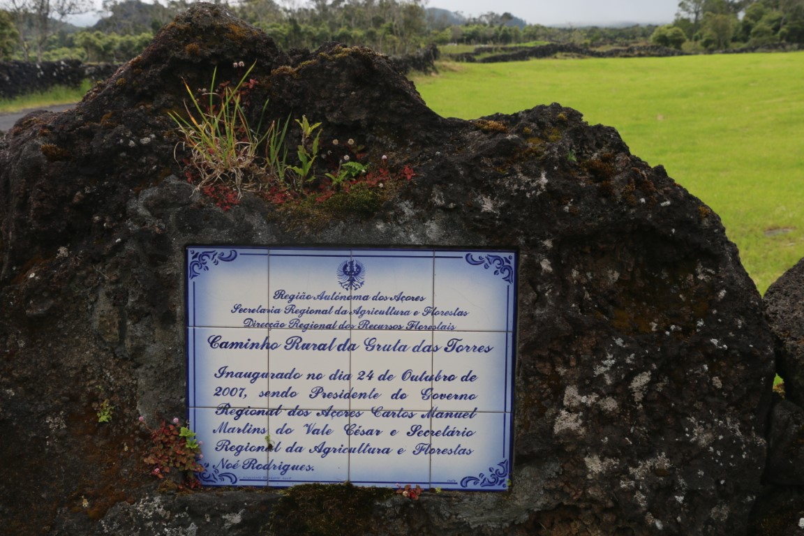 Der Himmel ist bedeckt und es sieht eher nach Regen als nach Sonne aus. Außer einem kurzen Nieselregen bleiben wir heute aber verschont und manchmal kommt sogar kurz die Sonne hervor. Zum Wandern also ideales Wetter. Der Weg zur Höhle ist kurzweilig und da abseits der Hauptverkehrswege auch sehr ruhig. Die Landschaft hier auf Pico ist anders als drüben auf Faial. Hauptunterschied sind die enormen Massen an schwarzem Tuffstein. Sie wurden sowohl als Baumaterial für Häuser und Stallungen benutzt als auch für Begrenzungen der Felder und Wiesen. Was dann noch über war, wurde stumpf zu Pyramiden gehäuft. Aber auch beim Weinanbau werden sie um die einzelnen Rebstöcke aufgeschichtet; als Wärmespeicher und Windschutz.