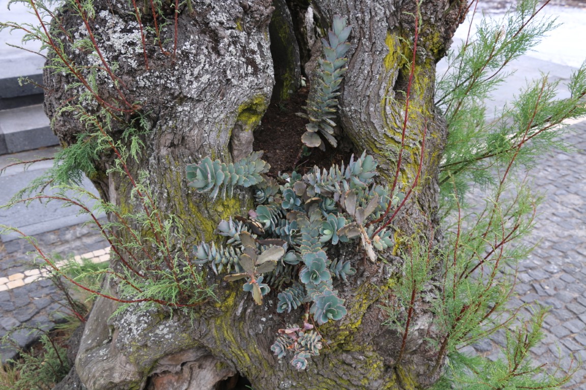 Auf Madalena angekommen, bietet sich uns an einem winzigen Seitenhafenbecken ein kleines Spektäkelchen (von Spektakel will ich mal nicht reden): eine Saugpumpe, von einem Riesen-Schwerlast-Kran gehalten, saugt Meerwasser auf, das dann durch einen dicken Schlauch auf die letzten Treppenstufen des Kirchplatzes geleitet wird. Von dort läuft es wieder ab ins Meer. Zwischen Meer und Treppen stehen dicke Betonklötze wie man sie schon mal auf Straßenabsperrungen sehen kann. Wir rätseln lange, was das wohl soll und kommen zu dem Schluss, dass die auf diese Art und Weise dieses kleine Hafenbecken von Algen befreien wollen.