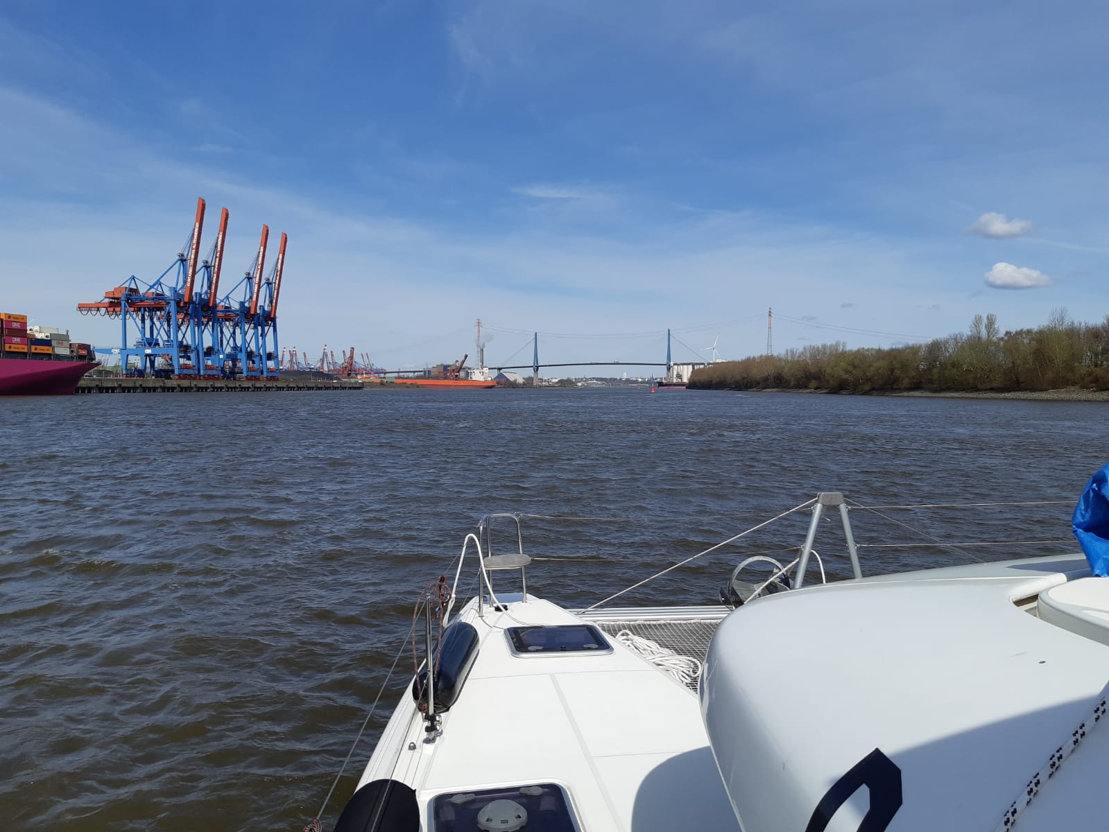 Auf der Elbe ist herrlichstes Sonnenschein-Wetter, aber kühl. Endlich wieder Platz um uns herum, der Autopilot wird jetzt nur noch im Minutenrhythmus umgestellt und schnell kommt Hamburg in Sicht.