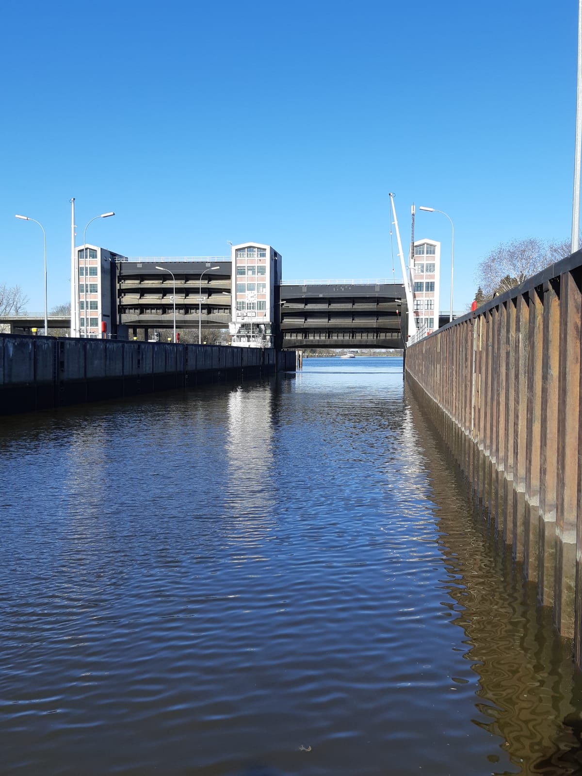 Unter der Köhlbrandbrücke laufen wir in die "richtige" Elbe ein, ab Hafen Hamburg ist es dann nicht mehr ein kleiner Fluss, sondern ein breiter Strom (bei Wedel dann 3 Kilometer breit).