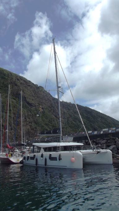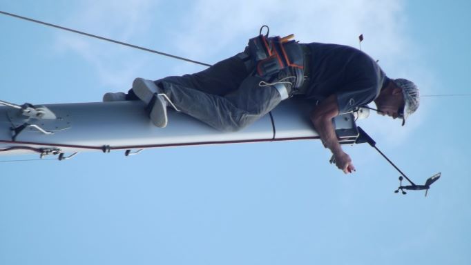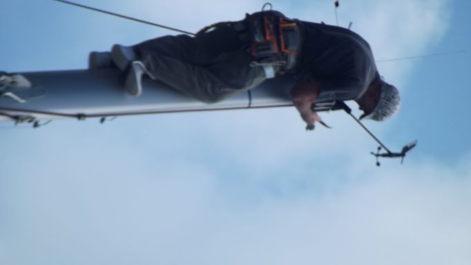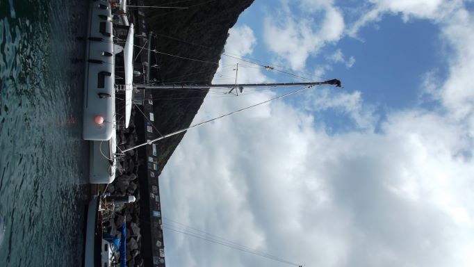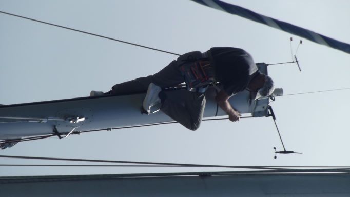 Wesentliche Aktion heute: Mast klarieren. Das ist immer eine double-handed-action. Michèle führt unten das Großfall, an dem ich gesichert bin. Und macht die „Decksarbeit“. Werkzeug rauf schicken, das ich vergessen habe, zum Beispiel. Gut – heute hatte ich alles dabei: Locktide-Flüssigkeit, um die Muttern der UKW-Antenne noch mehr zu sichern. Sie hat schon eine Kontermutter und ist nun an mehreren Stellen „getaped“ – festgeklebt mit Panzerband. Und nun auch noch gegen Öffnen verklebt. Hoffentlich haben wir nie wieder Schwierigkeiten damit!