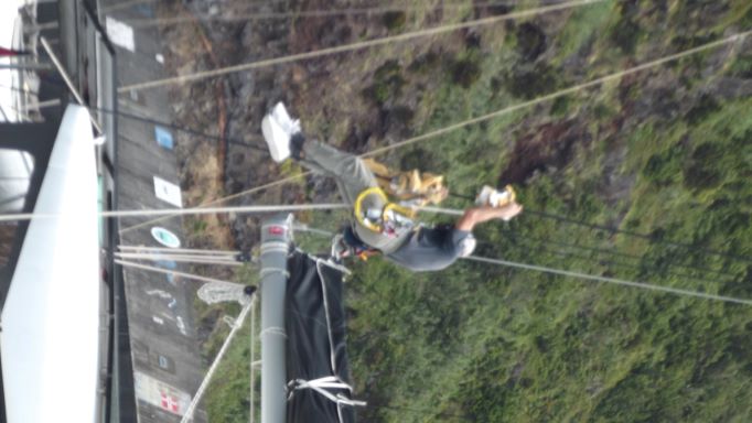 Dann habe ich versucht, eine Umlenkrolle in dem freien Schacht zu installieren. Wie mir die dann den Mast runter fällt – mit lautem Klappern wusste der ganze Hafen Bescheid, und falls nicht, dann bei meinem Schrei „Sch….“! Just in dem Moment hat Yoshi auf den Auslöser gedrückt und hat den Moment in Farbe verewigt. Na ja – ein zusätzliches Fall hätte ich gerne für das Groß-Segel. Wäre aber sowieso schwierig, da der freie Schacht vorne ist und das Großfall eigentlich hinten am Mast befestigt ist.