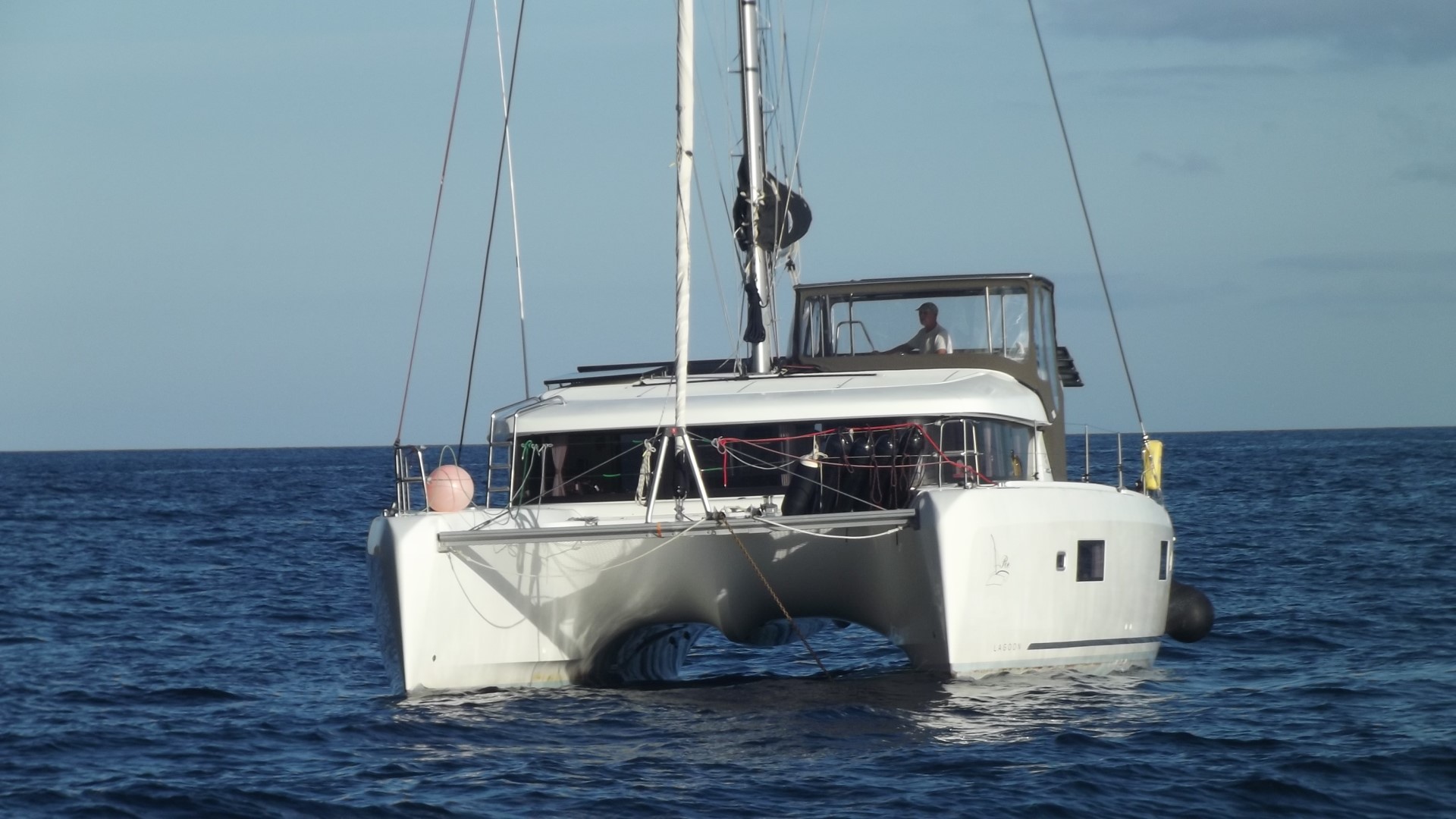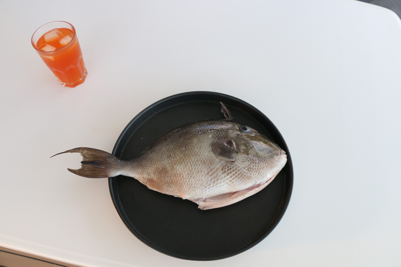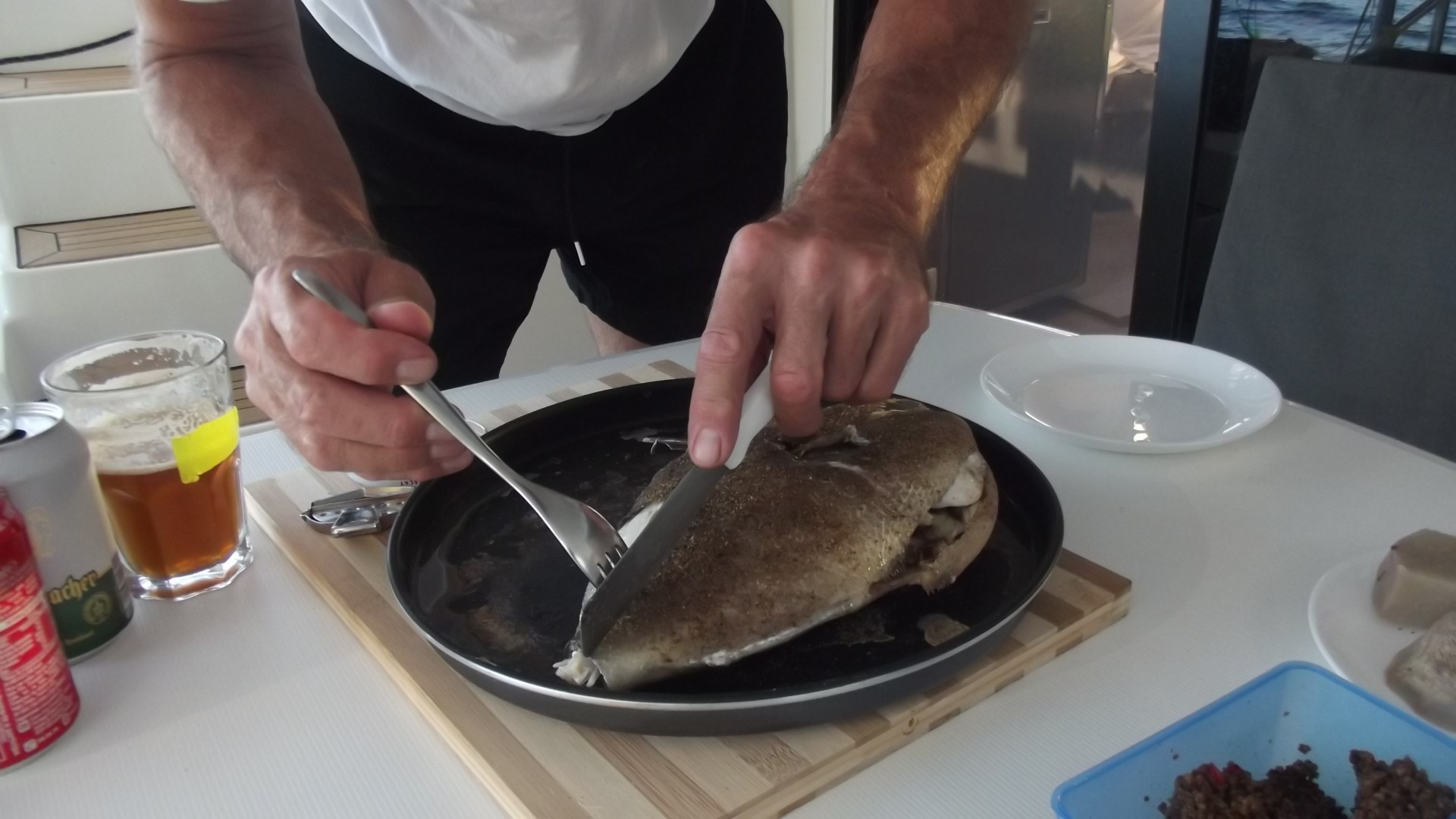 Yoshi war mit der DaYo schneller und weist uns in den Ankerplatz ein: Es schaukelt. Nicht nur ganz wenig. Aber er hat zwei Fische gefangen und kommt mit denen zum Grillen rüber. Drückerfische, er hatte gerade einen Schwarm unter sich, als er probierte, seine Angel in Ordnung zu bringen. Und die bissen schneller, als er rausziehen konnte. Der große ist genug für heute Abend, der kleine wandert in die Tiefkühltruhe. Drückerfische sind sehr leckere Speisefische mit einem festen, weißen Fleisch, fast so wie Hähnchen und schmecken auch so ähnlich.