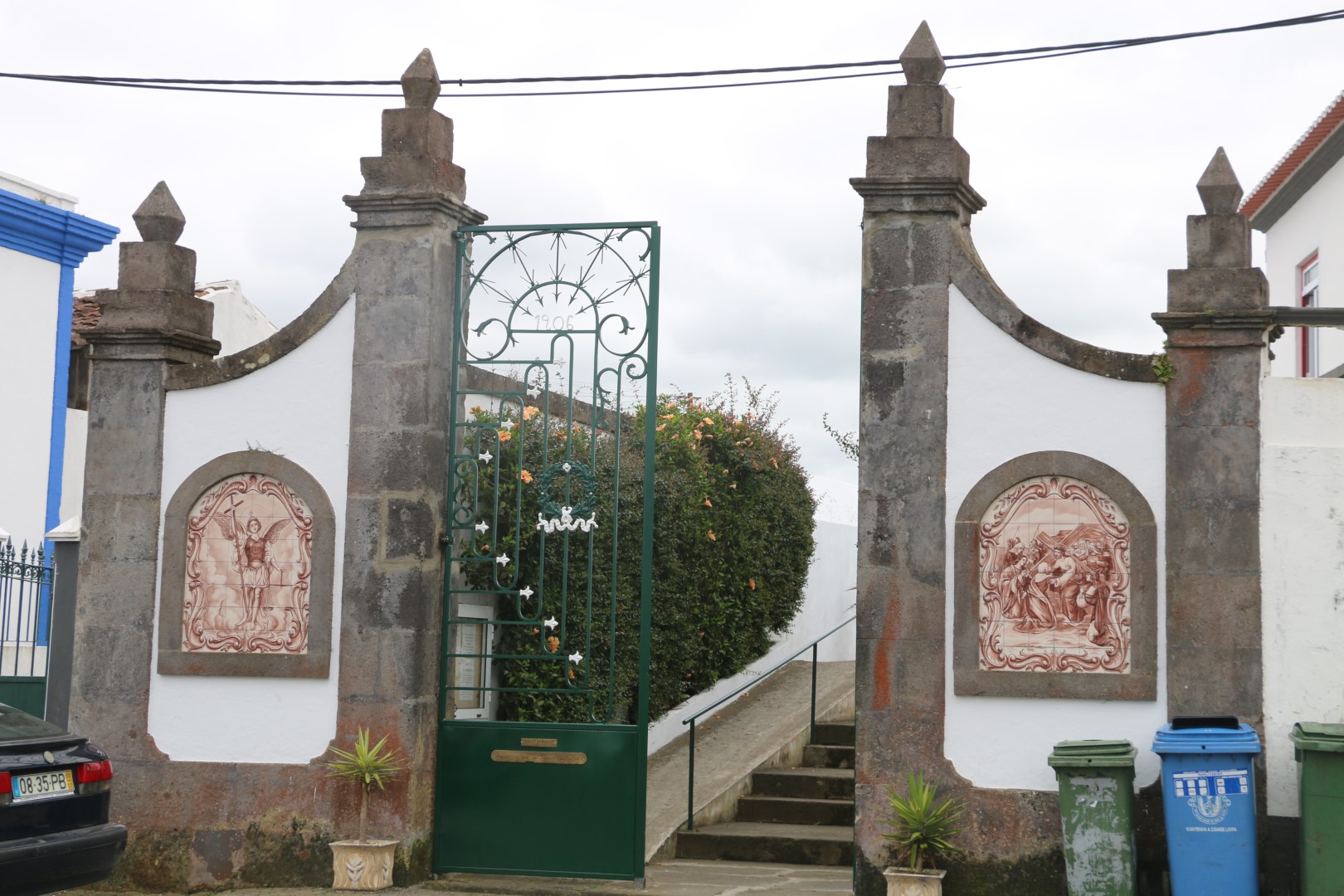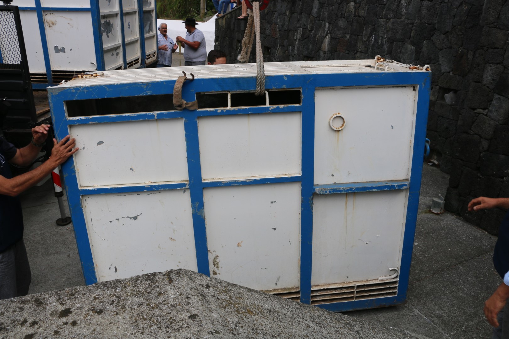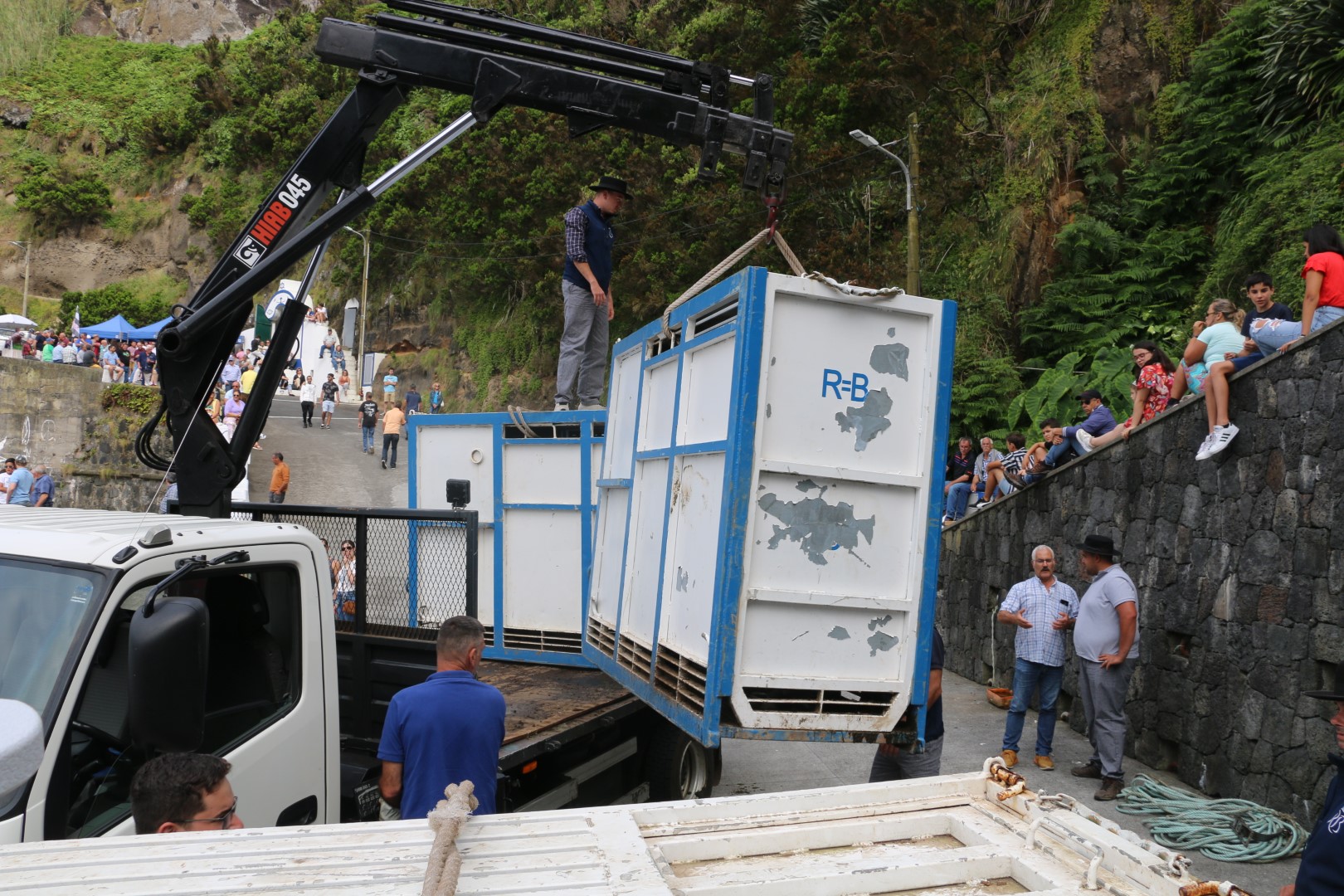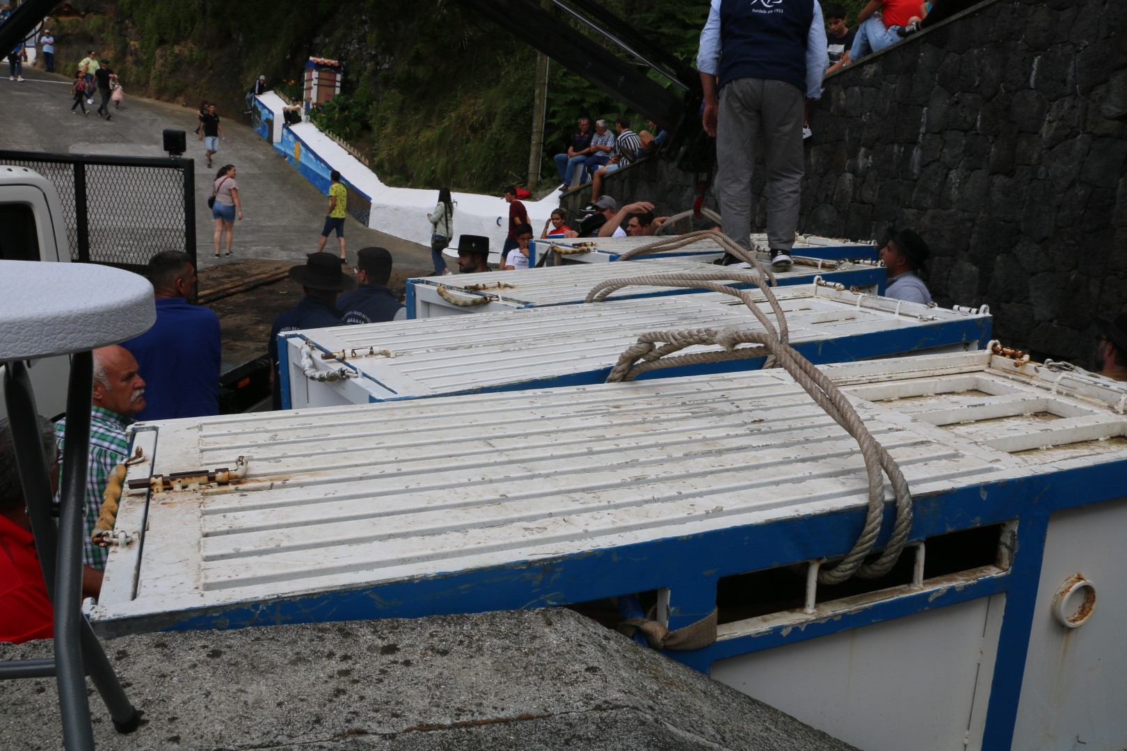 In der Pause möchte ich ein paar Fotos davon machen, wie dieser Hörnerschutz angebracht wird. Dafür muss ich auf ein Mäuerchen steigen. Ich habe aber noch nicht mal irgendwelche Anstalten gemacht um dorthin zu gelangen, da springt auch schon der erste auf, um mich vorbei zu lassen. In der Ecke der Mauer steht ein weiterer Gast und winkt mir zu, dass ich zu ihm kommen soll, von dort aus hätte man einen besseren Blick. Gesagt, getan. Wir kommen kurz ins Gespräch. Ach, ihr seid im Hafen von Praia da Vitória, na ich wohne direkt in der Nähe, da nehme ich euch mit. Ich habe zwar nur einen kleinen Wagen aber wartet hier, ich nehme euch mit. Dann muss er los. Ich bin jetzt etwas perplex. Zu 6 in einem kleinen Wagen? Und kommt er wirklich?